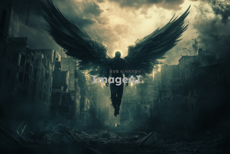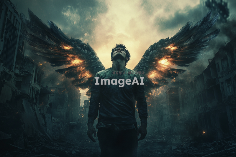 어두운 망한 도시의 황량한 거리 위에서 둥둥 떠 있는 남성 천사. 그의 날개는 빛을 발하며, 슬퍼하는 남자를 위로하려는 구세주의 모습. 배경은 폐허가 된 건물들과 어두운 구름으로 가득 차 있으며, 천사의 표정은 따뜻하고 희망적인 느낌을 주고 있다.
