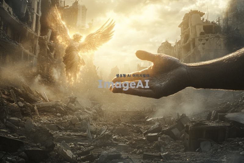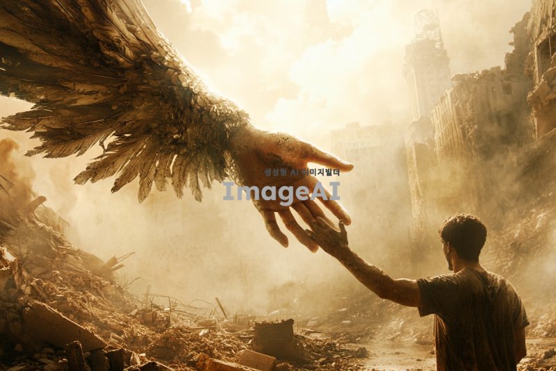 붕괴된 도시의 잔해 속에서 슬퍼하는 남자의 손과 그를 구원하기 위해 나타난 천사의 손이 닿을 듯 말 듯 하는 장면. 배경은 황량한 도시 풍경으로, 먼지와 잔해가 가득한 분위기. 천사의 손은 빛나는 느낌으로 표현되고, 남자의 손은 힘없이 떨어져 있는 모습. 전체적으로 신비롭고 감정적인 분위기를 강조하여, 천지창조의 느낌을 담아내기.