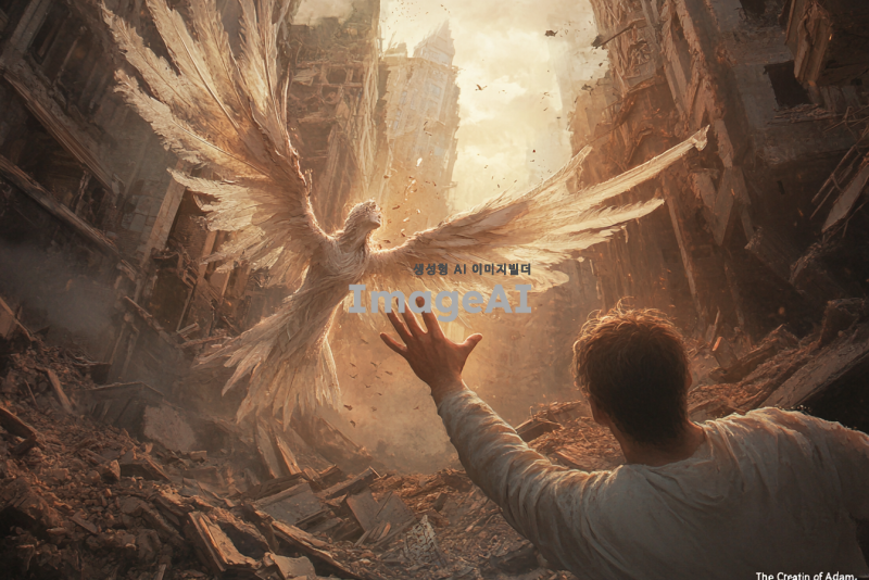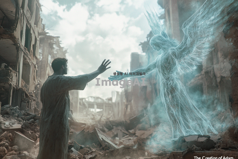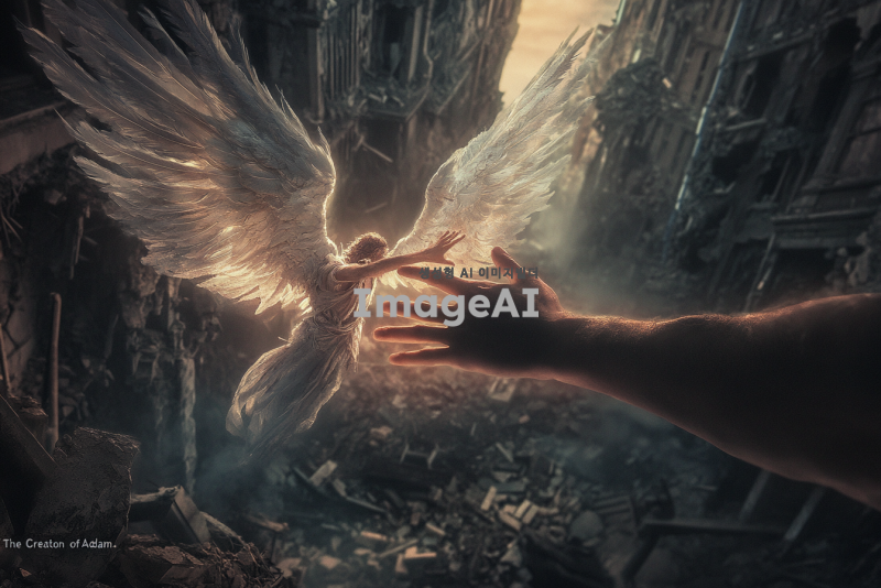 붕괴된 도시 속에서 절망한 남자가 구세주 천사의 손을 잡으려고 하는 장면. 두 손이 닿으려고 하는, 손 부분만 장면 구성. 배경은 황량한 도시의 잔해로 가득 차 있음. 분위기는 희망과 절망이 교차하는 느낌을 담아내고, 천사는 부드럽고 따뜻한 빛을 발산. 명화 천지창조처럼 손이 서로 닿으려고 하는 느낌.