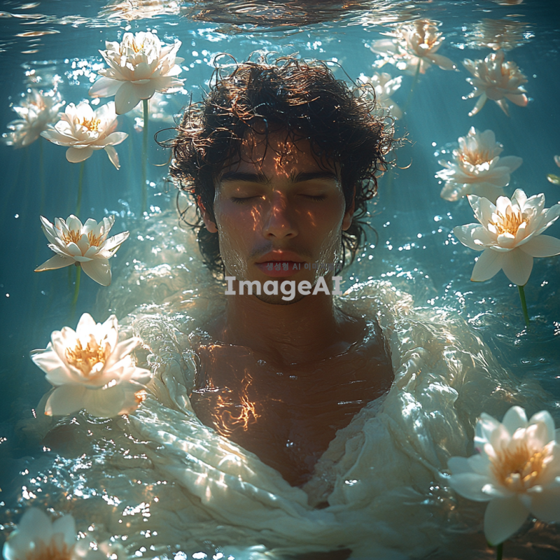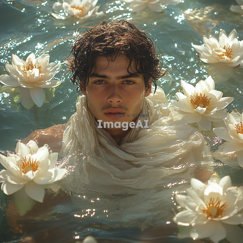 고대 이집트 복장을 한 젊은 이집트 남성이 연꽃이 만발한 물속에 잠겨있는 모습. 부드러운 햇살이 물속으로 비추고, 연꽃들이 화사하게 피어있는 배경. 남성의 표정은 평온하고 신비로운 분위기를 자아내며, 물의 흐름과 함께 우아하게 움직이고 있다.