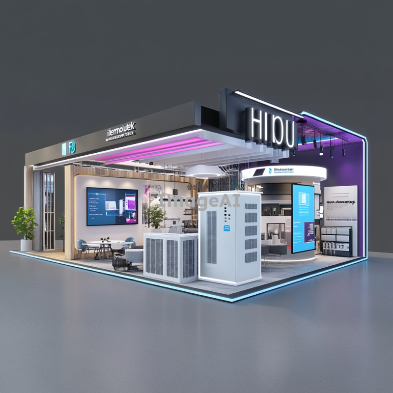9x9 부스 내부의 다양한 존을 포함한 IFS 프랜차이즈 창업산업 박람회 장면을 그려주세요. 부스 안에는 에어컨 유지보수 시연 존, IoT 모니터링 존, HVAC 기술을 소개하는 디지털 스크린, B2B 미팅룸으로 활용되는 상담 공간, 하이엠솔루텍 브랜드를 소개하는 브랜드 존, 그리고 창고 및 스태프 공간이 배치되어 있습니다. 전체적인 분위기는 현대적이고 전문적인 느낌을 주며, 각 존의 기능이 잘 드러나도록 해주세요.