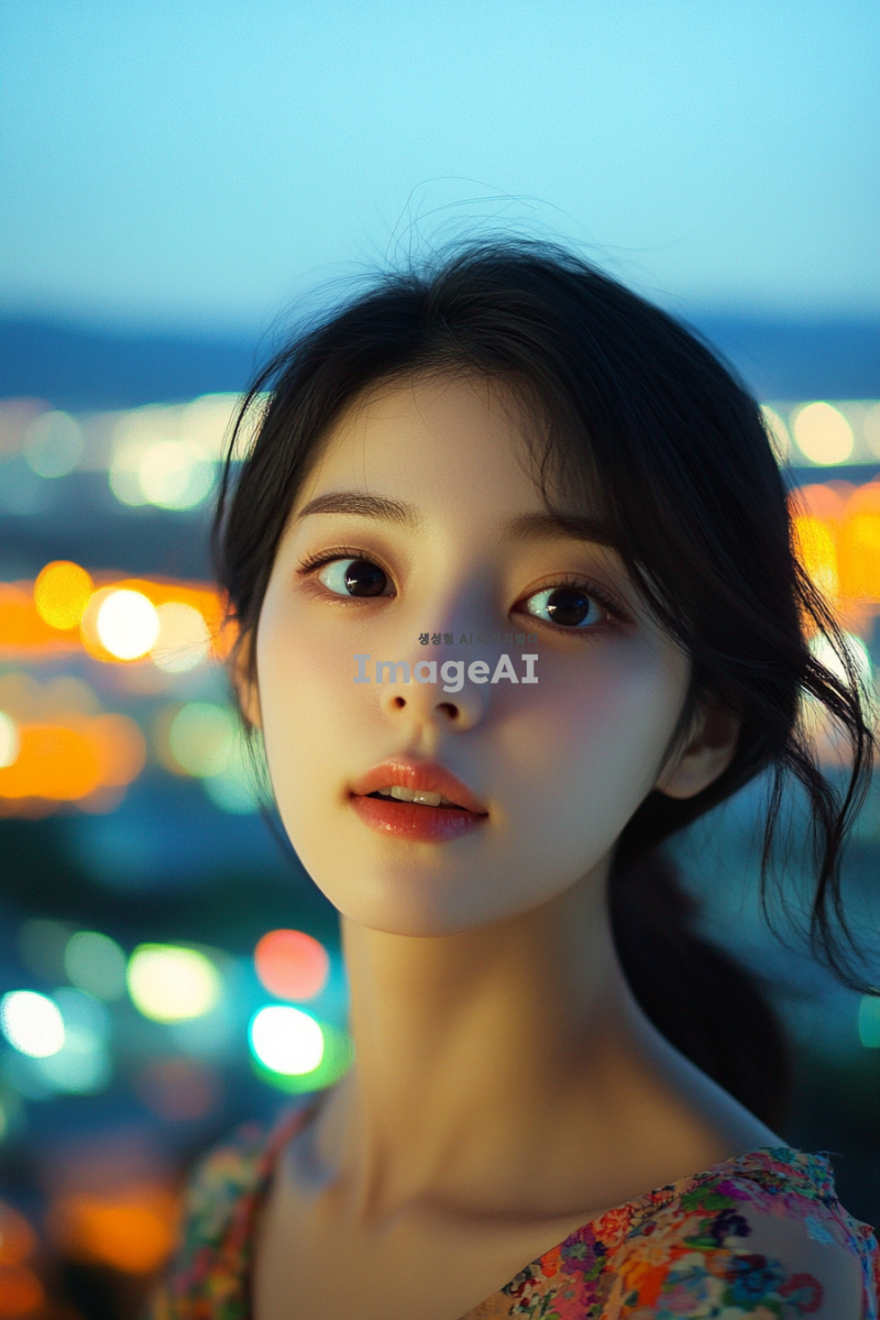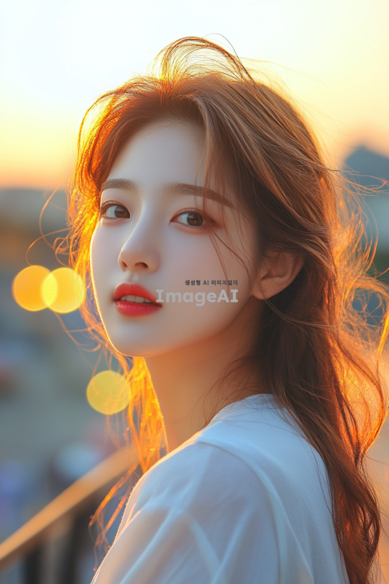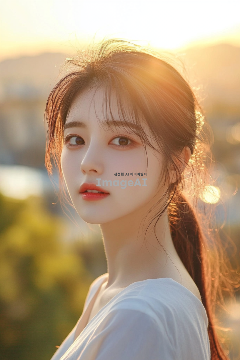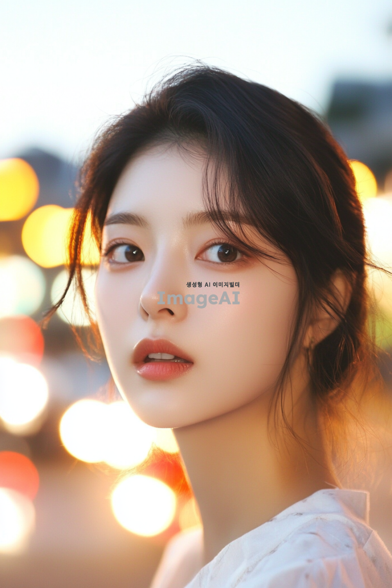젊은 한국 여성의 얼굴, 밝고 생기 넘치는 표정, 자연스러운 메이크업, 부드러운 조명, 배경은 흐릿한 도시 풍경, 따뜻한 색조의 이미지, 귀여운 스타일의 헤어스타일, 눈빛은 자신감 넘치고 친근한 느낌.