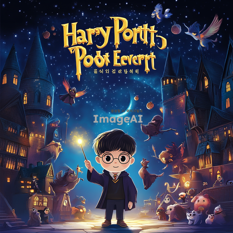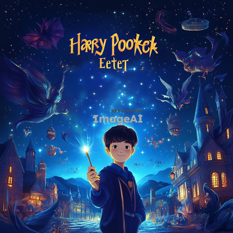 해리포터 세계관의 마법 학교를 배경으로 한 이벤트 배너 디자인. 배너 중앙에는 마법 지팡이를 들고 있는 한국인 소년이 서 있고, 그 주위에는 다양한 마법 생물과 마법 아이템들이 떠다니고 있다. 배너 상단에는 '해리포터 도서 이벤트'라는 텍스트가 환한 금색 글씨로 적혀 있으며, 배경은 신비로운 밤하늘과 별들로 가득 차 있다. 전체적인 색감은 판타지 느낌을 주는 깊은 파란색과 보라색 톤으로 조화롭게 구성되어 있다.