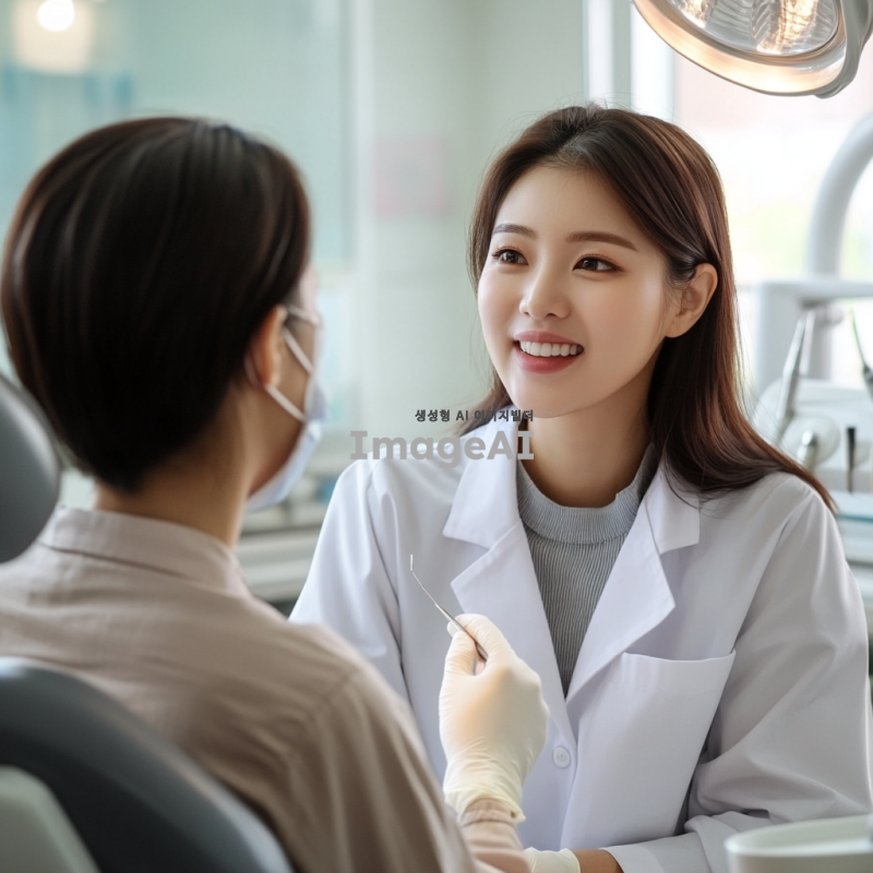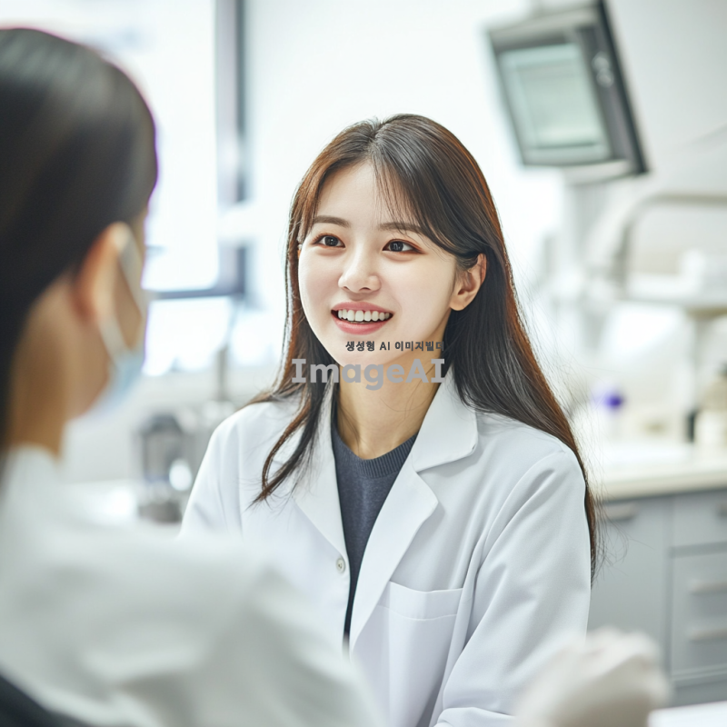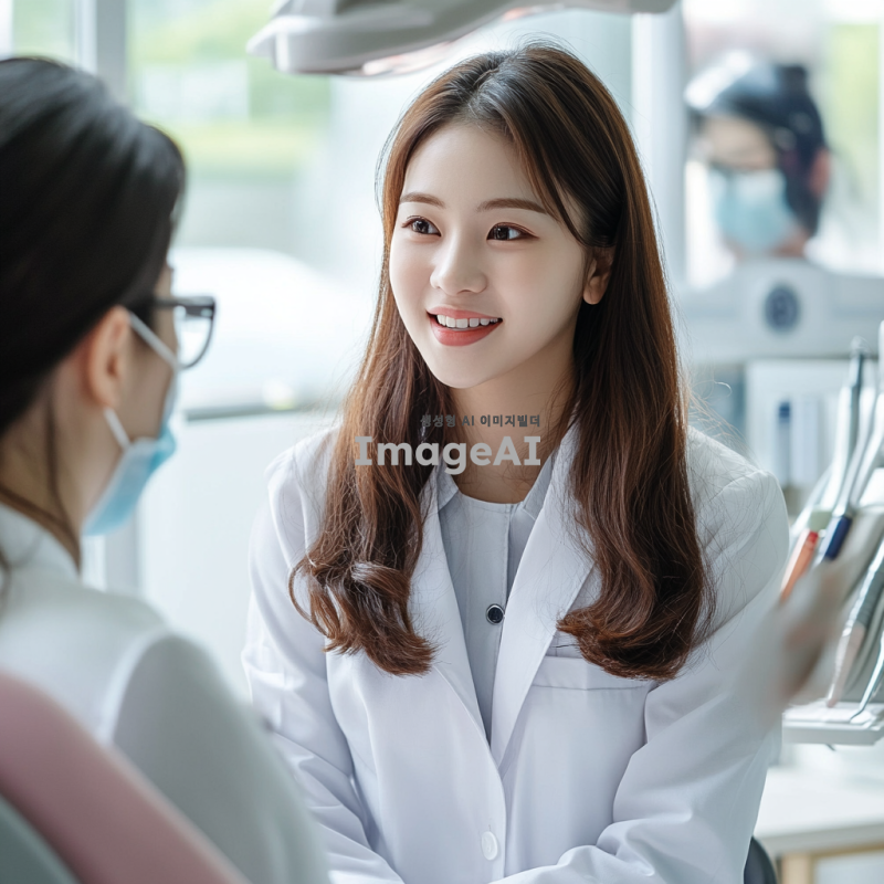 여자 치과의사가 환자와 상담하는 모습, 현대적인 치과 진료실 배경, 전문적인 표정과 친절한 미소, 청결하고 밝은 분위기, 의료 도구와 장비들이 잘 정리되어 있는 모습, 한국인 여성 치과의사, 세련된 의사복 착용, 진지한 대화 중인 장면.