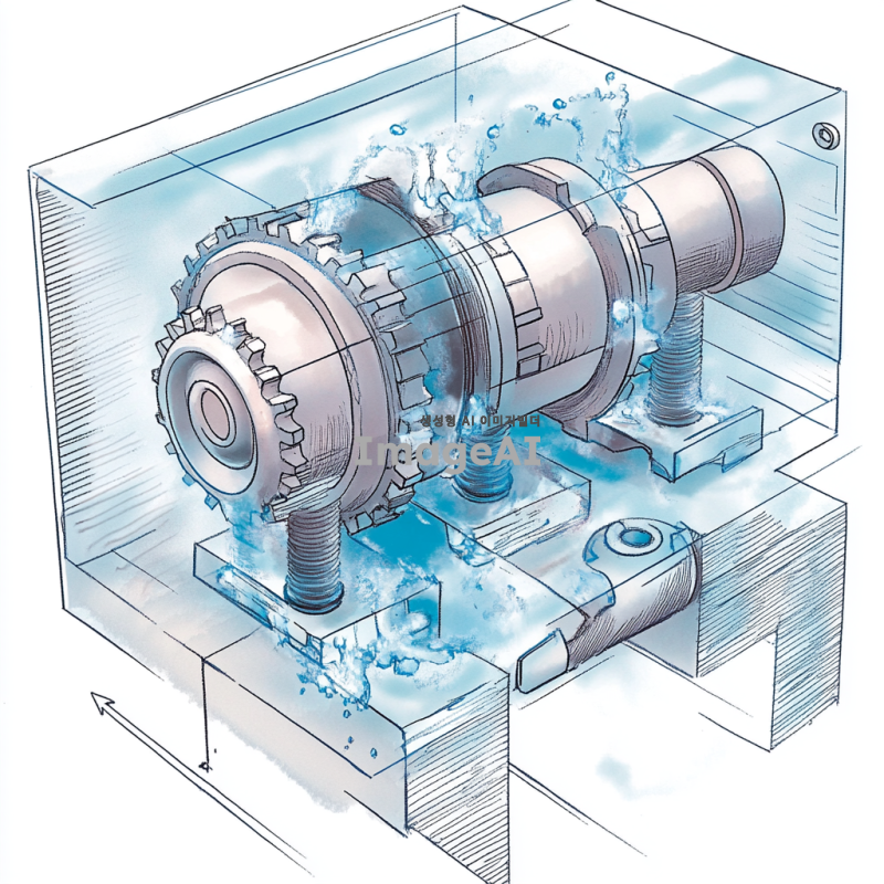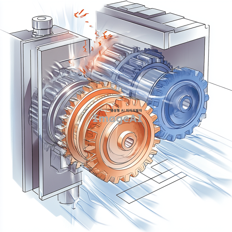 기어펌프가 열을 받아 구동이 잘 되지 않는 모습: 기어펌프가 과열되어 기어가 느리게 회전하거나 멈춰 있는 상황을 그려주세요. 기어의 표면에 열로 인한 변형이나 손상이 나타나고, 주변에 열기와 함께 경고 표시가 있는 모습을 추가해 주세요. 기어와 유체의 흐름이 원활하지 않은 상태를 강조해 주세요.