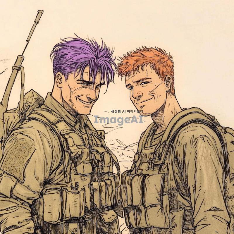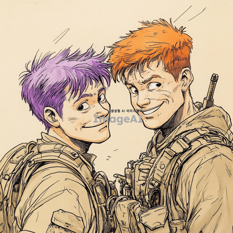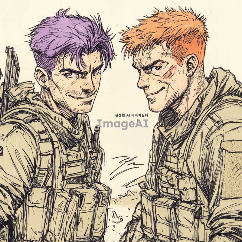 보라색 머리를 하고 있는 스나이퍼 군인 형과 붉고 짧은 머리를 하고 왼쪽 눈에 긴 상처가 있는 기동보병인 동생이 함께 서 있는데 형은 동생을 보고 웃고 있고 동생은 부끄러워하는 그림