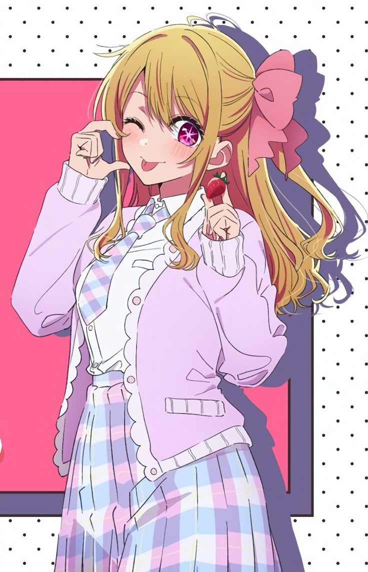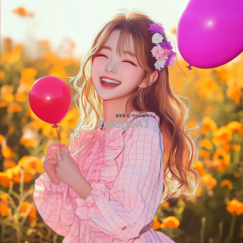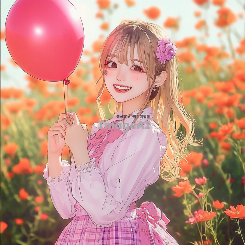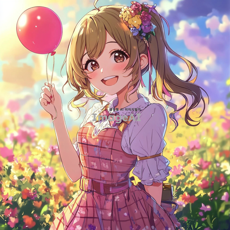 최애의아이 루비를 주제로 한 이미지, 귀여운 스타일의 한국 소녀가 루비색의 드레스를 입고 행복하게 웃고 있는 모습, 배경은 화사한 꽃밭, 햇살이 따뜻하게 비추는 분위기, 소녀의 머리에는 작은 꽃장식이 있고, 손에는 루비색 풍선을 들고 있는 장면.
