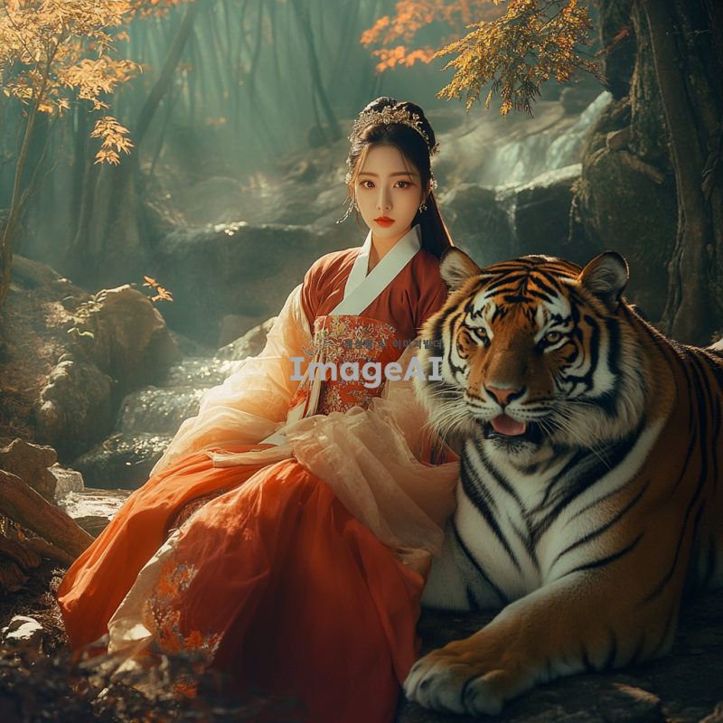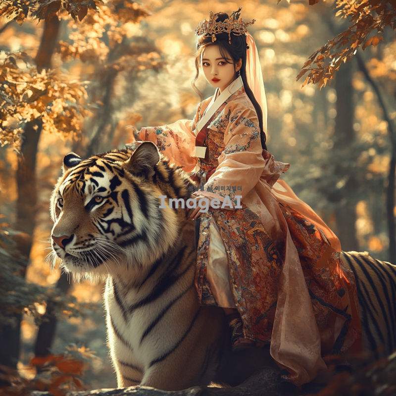 호랑이 등에 앉아있는 한국의 어우동, 전통 한복을 입고 우아한 포즈를 취하고 있는 모습, 배경은 울창한 숲과 자연, 부드러운 햇살이 비추는 장면, 동양적인 아름다움과 강렬한 호랑이의 힘이 조화를 이루는 이미지.