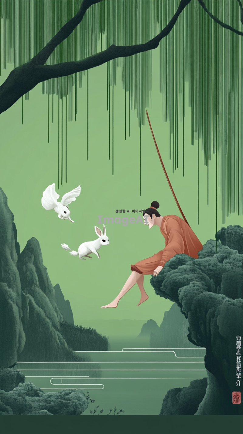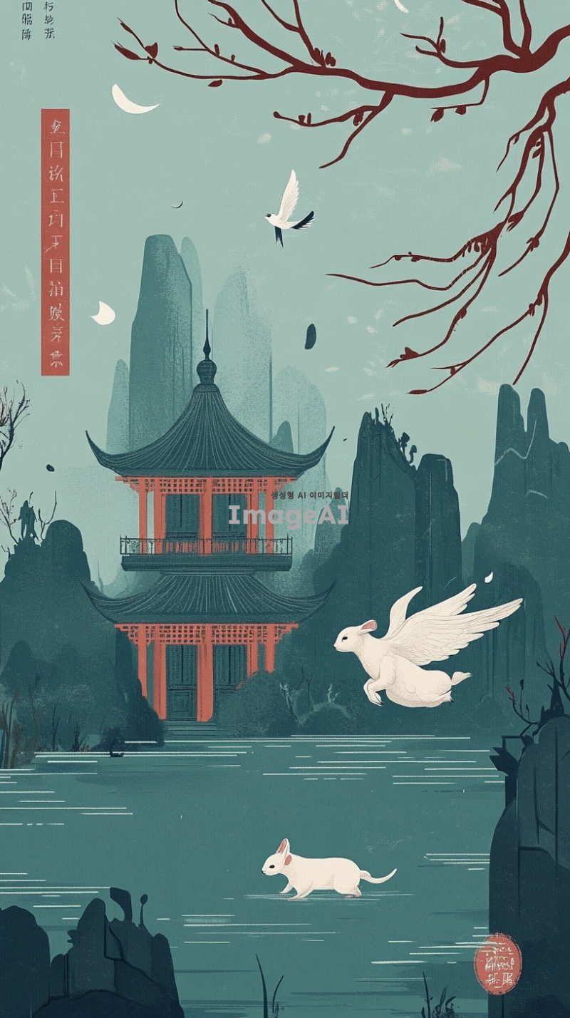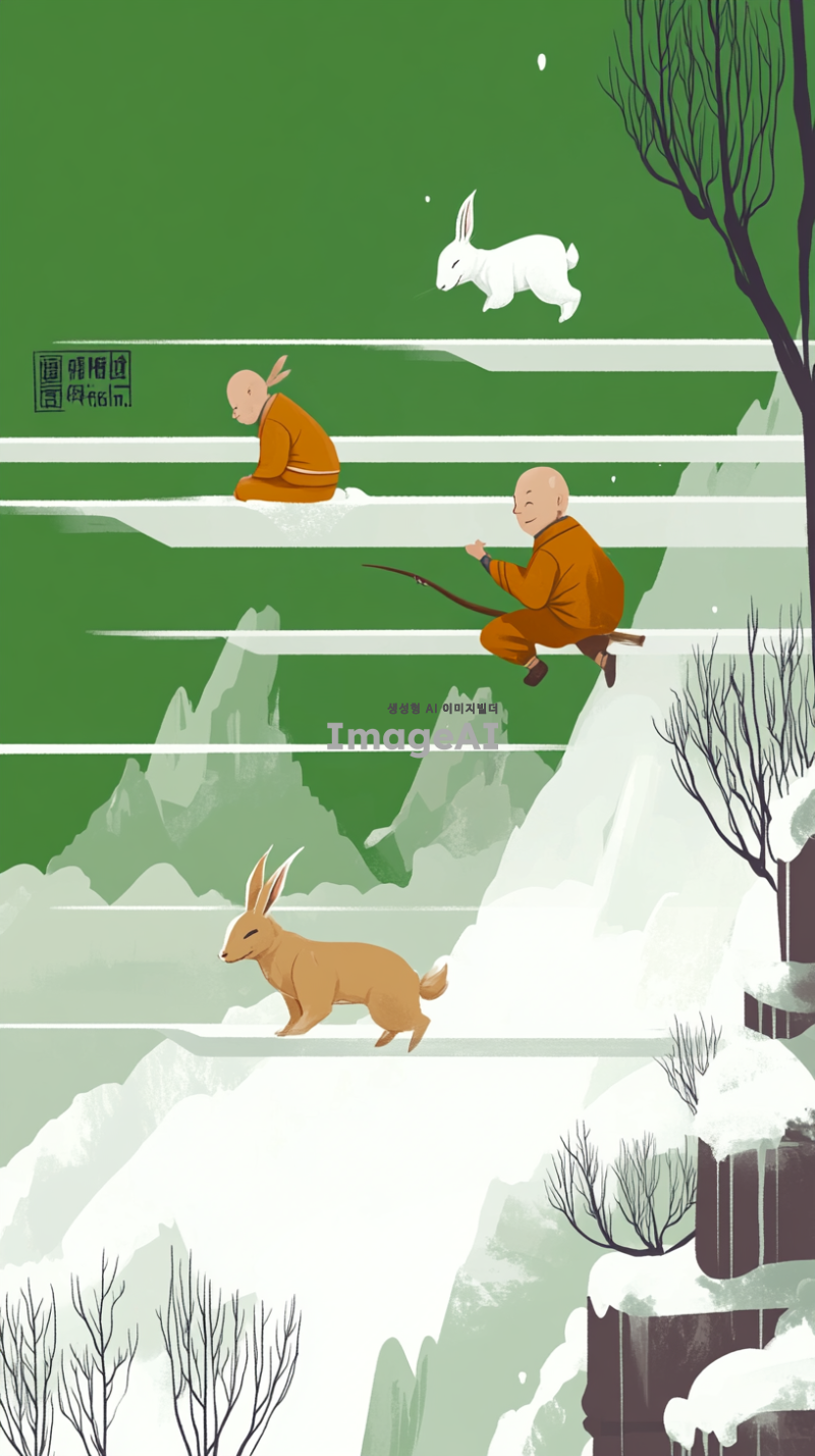 사자성어 "토사구팽"을 주제로 한 일러스트. 배경은 고전적인 중국 풍경으로, 한쪽에는 토끼가 도망가고 있는 모습, 다른 쪽에는 사냥꾼이 토끼를 놓친 개를 바라보며 냉정하게 웃는 장면을 그린다. 전체적인 색감은 차가운 느낌으로, 각각의 캐릭터는 감정을 잘 표현하고 있어야 한다.