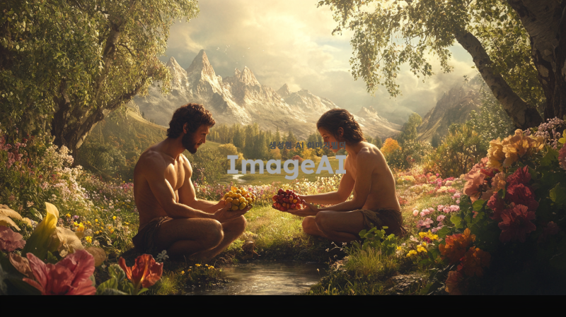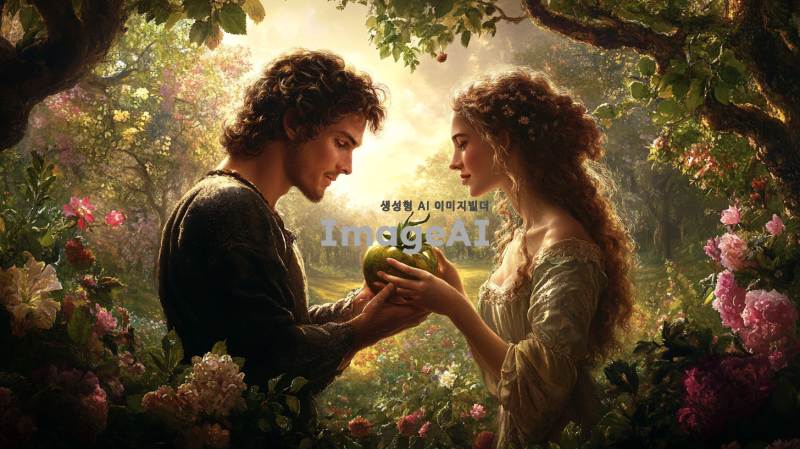 아담과 하와가 에덴동산의 아름다운 풍경 속에서 선악과를 먹고 있는 장면. 화창한 날씨와 푸르른 나무들, 다채로운 꽃들이 만발한 정원. 아담은 건강하고 근육질의 남성으로, 하와는 우아하고 아름다운 여성으로 묘사. 두 사람은 서로를 바라보며 선악과를 나누어 먹는 모습. 신비로운 분위기와 함께 신성한 빛이 그들 주위를 감싸고 있는 장면.