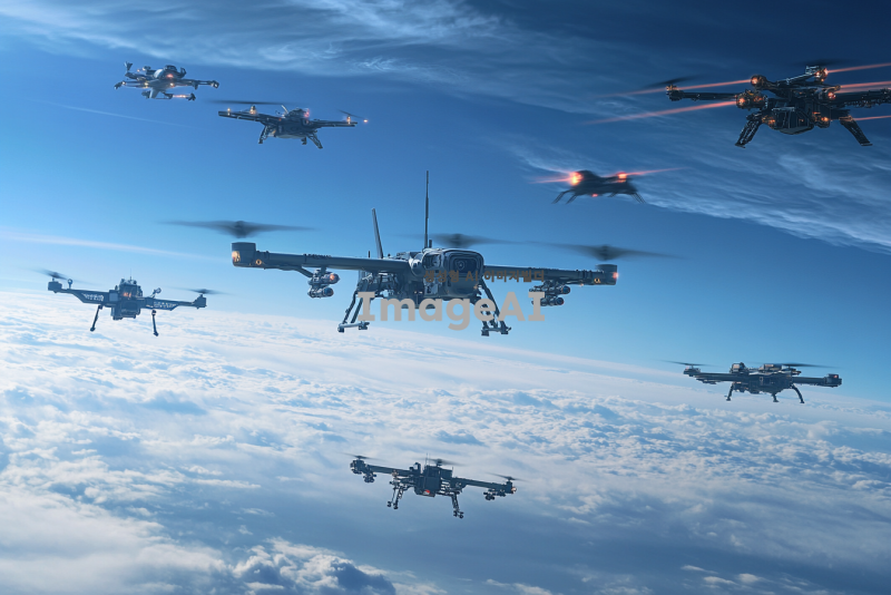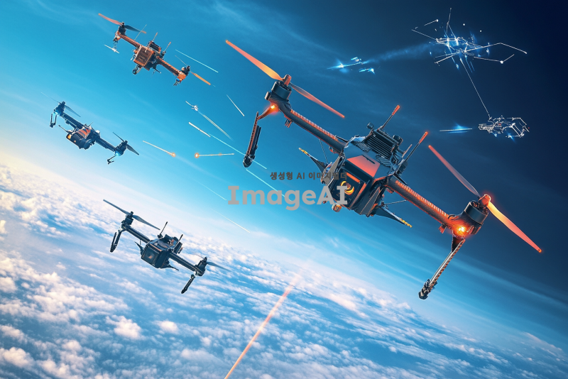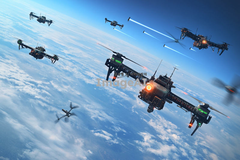 지구 낮은 위치에서 여러 대의 전투 드론들이 공중에 떠 있는 모습, 드론들은 각각 다양한 디자인과 색상으로, 하늘에는 여러 개의 위성이 떠 있으며, 드론과 위성 간의 통신이 이루어지는 장면을 생생하게 표현. 배경에는 푸른 하늘과 구름이 어우러져 있으며, 드론의 프로펠러가 회전하는 모습과 위성의 전파 송수신 장치가 강조됨.