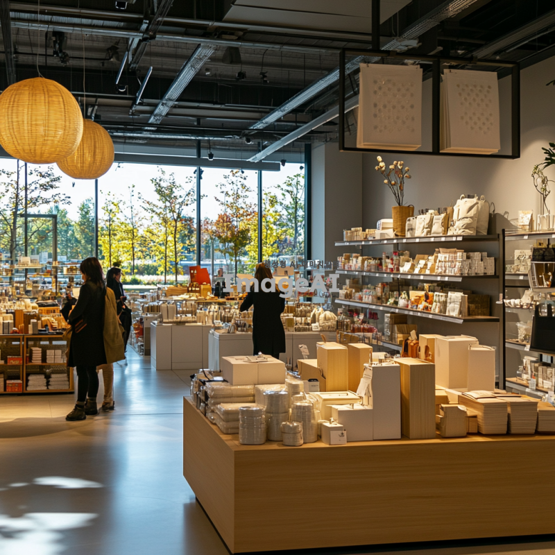 이케아 매장 내부, 현대적이고 깔끔한 인테리어 디자인, 다양한 가구와 소품들이 진열된 모습, 자연광이 들어오는 창가, 고객들이 쇼핑하는 모습, 스칸디나비아 스타일의 따뜻한 분위기, 편안한 색조와 실용적인 배치, 전체적으로 아늑하고 실용적인 공간 느낌.