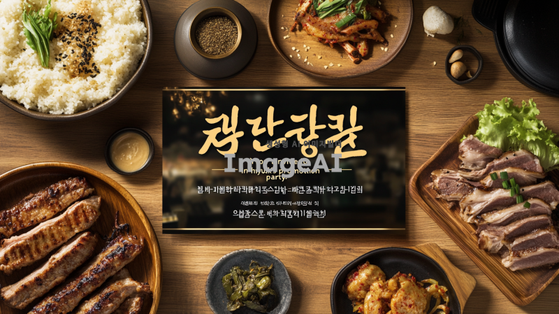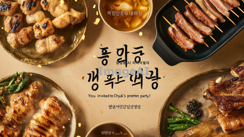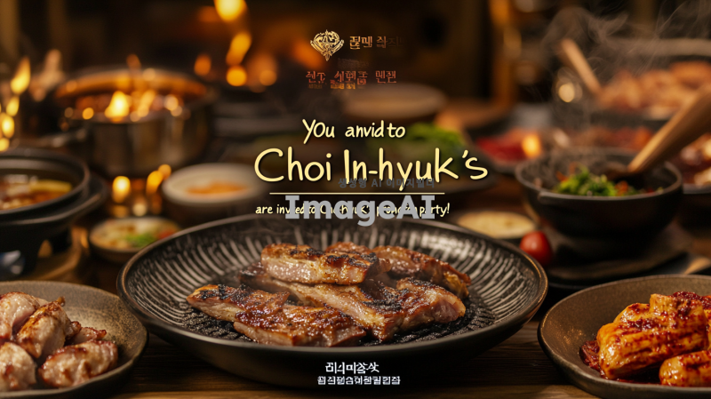 세련된 디자인의 초대장, 회사 진급 회식, 배경은 정겨운 삼겹살집 분위기의 이미지, 중앙에 "최인혁님의 진급파티에 초대합니다!"라는 문구, 현대적인 폰트 사용, 축하하는 분위기, 한국적인 요소를 가미한 세련된 느낌, 색상은 금색과 흰색 조화, 고급스러운 느낌 강조. 일자는 3월 4일 시간은 퇴근후