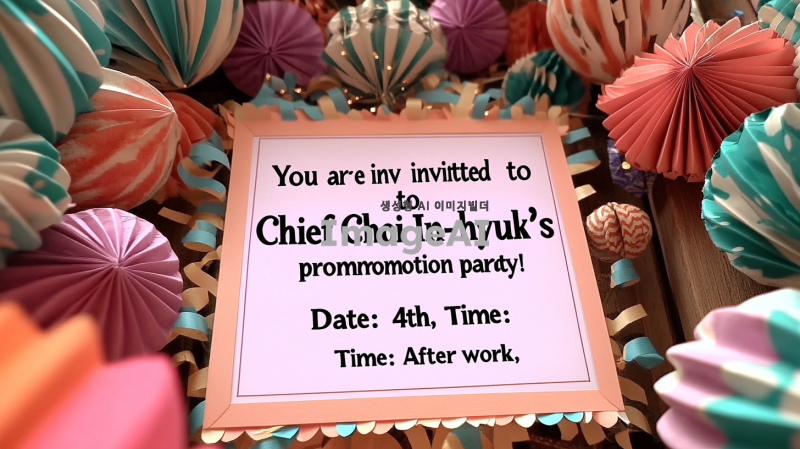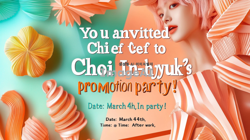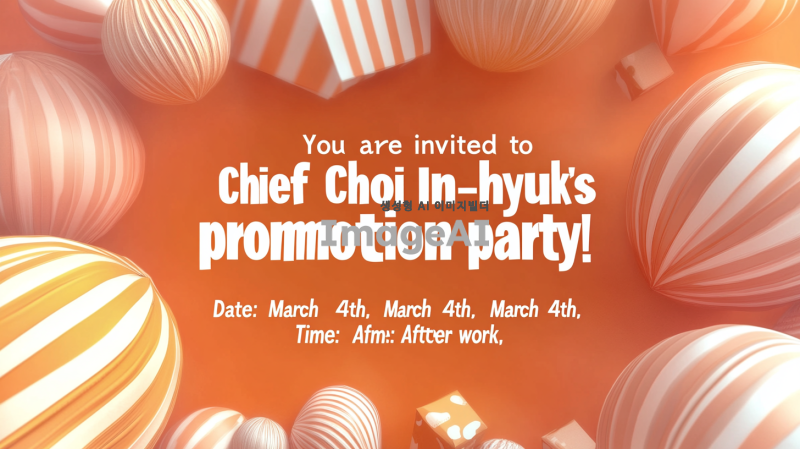 최인혁 주임의 진급파티 초대장 디자인, 배경에는 축하하는 분위기의 파티 장식, 중앙에 "최인혁 주임의 진급파티에 초대합니다!"라는 문구, 아래쪽에 "일자: 3월 4일, 시간: 퇴근 후"라는 세부 정보, 따뜻하고 환영하는 색감으로 구성, 세련된 글씨체 사용.