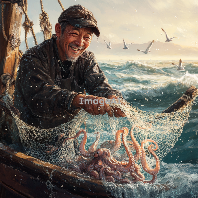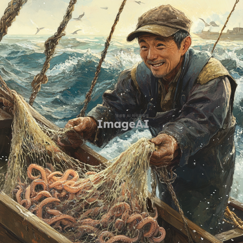 전통적인 나무 어선 위에서 한 어부가 커다란, 물이 뚝뚝 떨어지는 그물망을 힘차게 끌어올리고 있다. 그물 안에는 작은 쭈꾸미들이 가득 들어있고, 그는 이를 바라보며 따뜻하고 즐거운 미소를 짓고 있다. 그의 눈가는 기쁨으로 살짝 주름이 잡히고, 쭈꾸미들은 그물 안에서 꿈틀거리며 살아 있는 듯한 생동감을 준다.