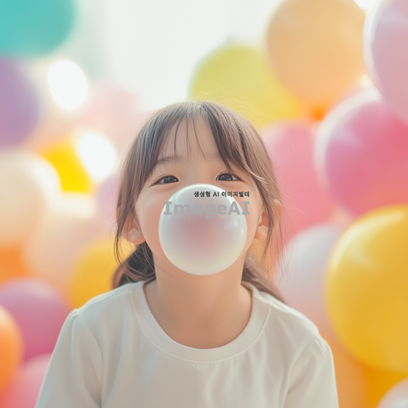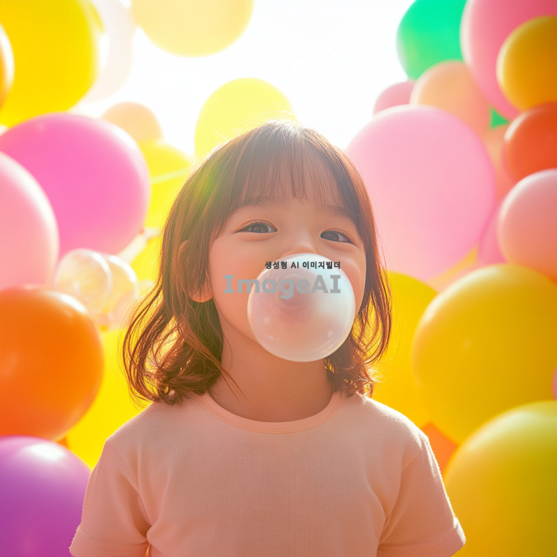 밝고 화사한 배경 속에서 풍선껌을 부는 한국인 아이의 모습. 아이는 웃고 있으며, 풍선껌이 커다랗게 부풀어 올라 있는 모습. 주변에는 다채로운 색상의 풍선과 장난감이 어우러져 있는 장면. 아이의 표정은 즐겁고 해맑으며, 햇살이 비추는 따뜻한 분위기.