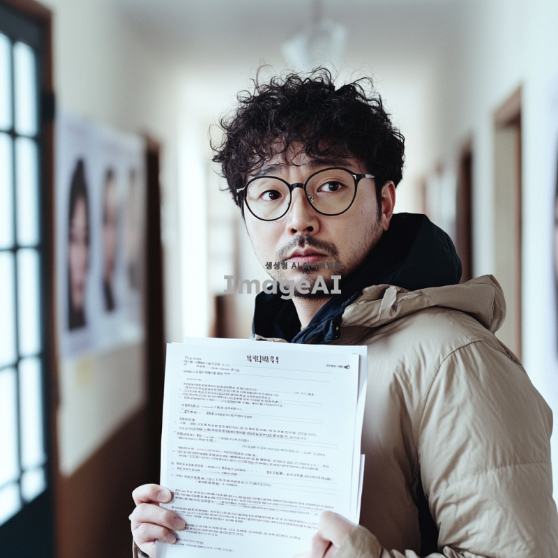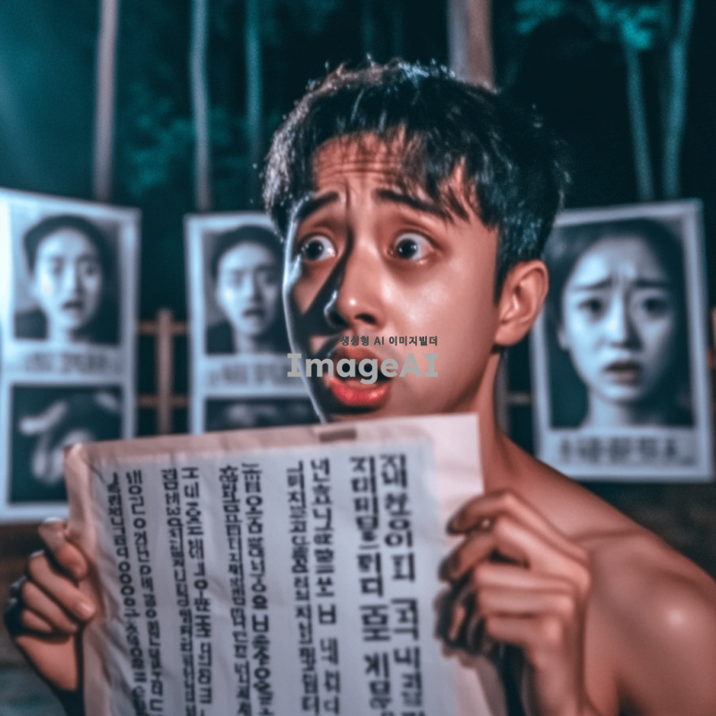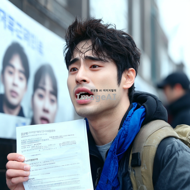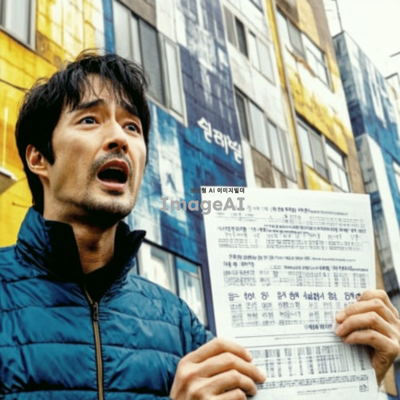전세사기 피해를 주제로 한 이미지: 한 남성이 전세 계약서 앞에서 불안한 표정을 짓고 있는 모습. 배경에는 어두운 분위기의 아파트 단지가 보이고, 주변에는 전세사기를 당한 사람들의 슬픈 표정이 담긴 포스터들이 붙어 있다. 남성의 손에는 계약서가 들려 있고, 그의 눈빛에는 불안과 걱정이 가득하다.