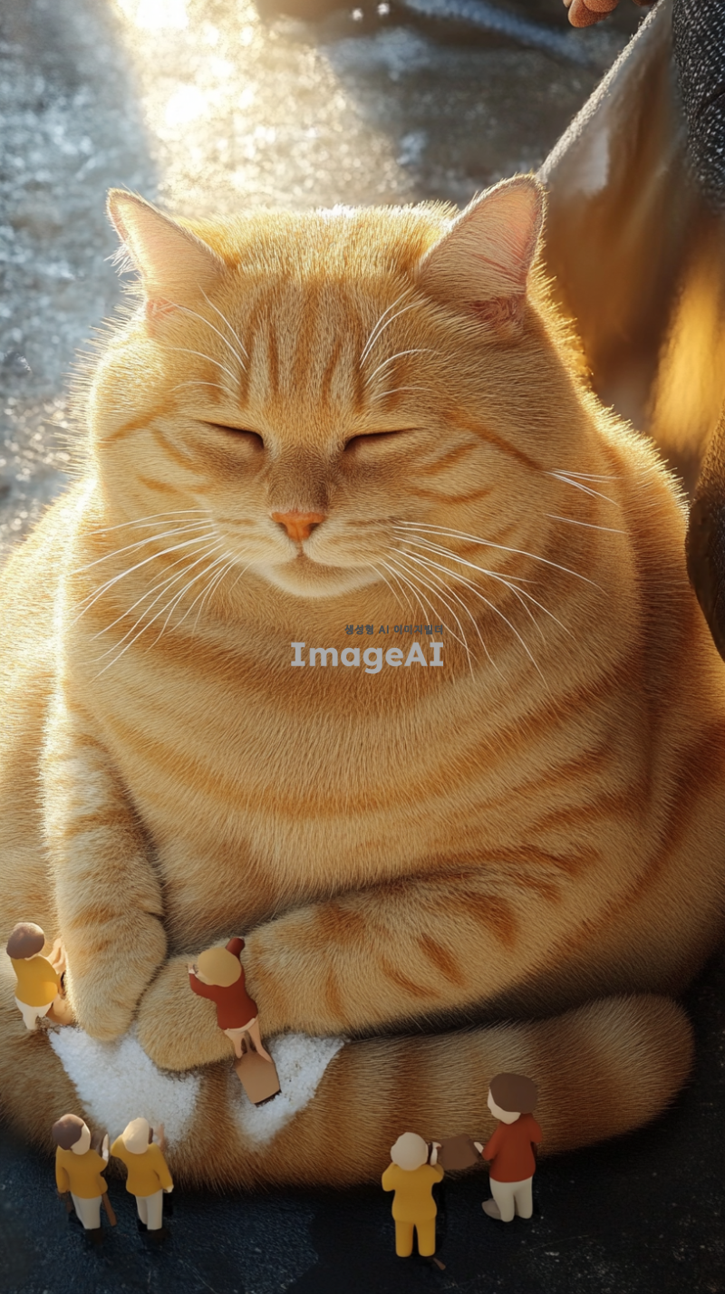 A massive, fluffy ginger cat is sitting calmly, its fur glowing warmly in the sunlight. Tiny human figures, dressed like animal caretakers, are interacting with the cat. Some are brushing its fur with oversized brushes, others are massaging its head, and a few are climbing onto its back as if exploring a soft, furry mountain. A small group is cleaning its paws with tiny towels. The scene is heartwarming and cinematic, with soft natural lighting and a cozy atmosphere. The background is blurred with warm tones, resembling a peaceful outdoor setting. Ultra-detailed, hyper-realistic, high-quality, 4K.