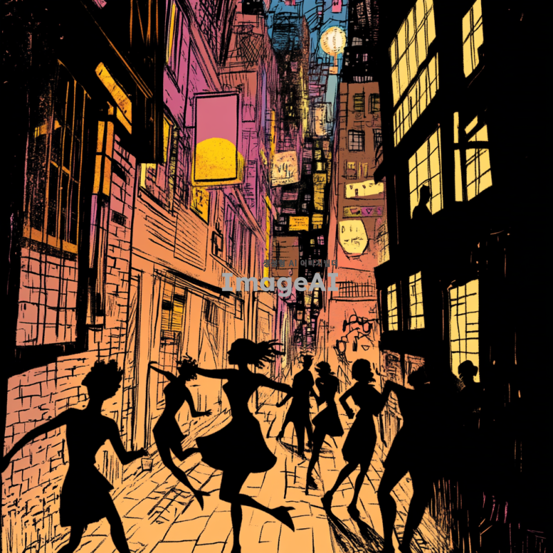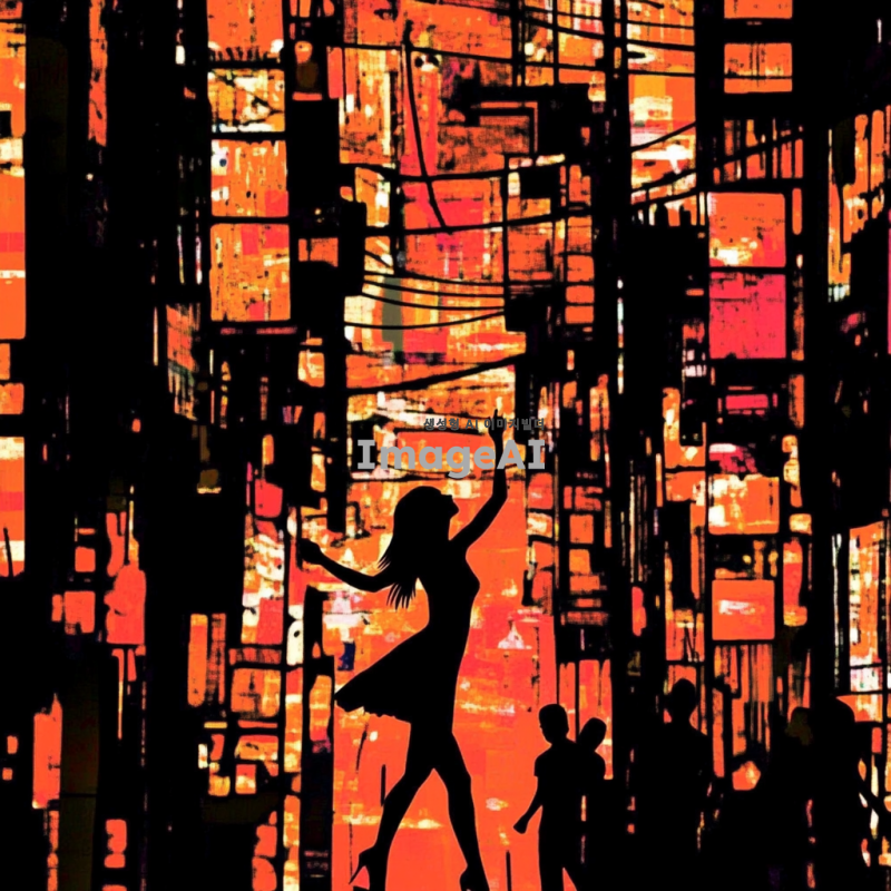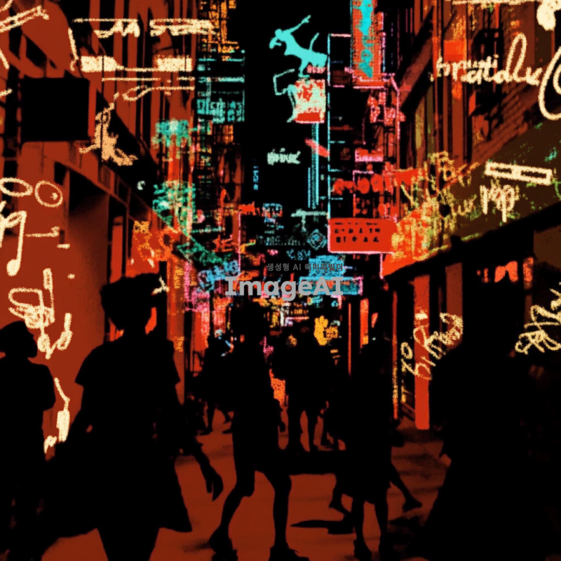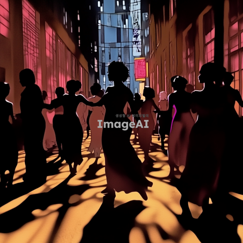 그루비한 느낌의 힙합 R&B 곡에 어울리는 이미지를 위해, 도시의 밤 풍경을 배경으로 화려한 네온사인과 함께 음악을 즐기는 사람들의 실루엣이 자연스럽게 어우러진 장면을 만들어보세요. 따뜻한 색조의 조명이 흐르는 거리에서, 다양한 인종의 사람들이 함께 모여 춤추고 있는 모습이 담긴 이미지. 음악의 리듬을 느낄 수 있는 에너지 넘치는 분위기와 함께, 세련된 패션을 입은 인물들이 자연스럽게 배치된 장면을 표현해 주세요.