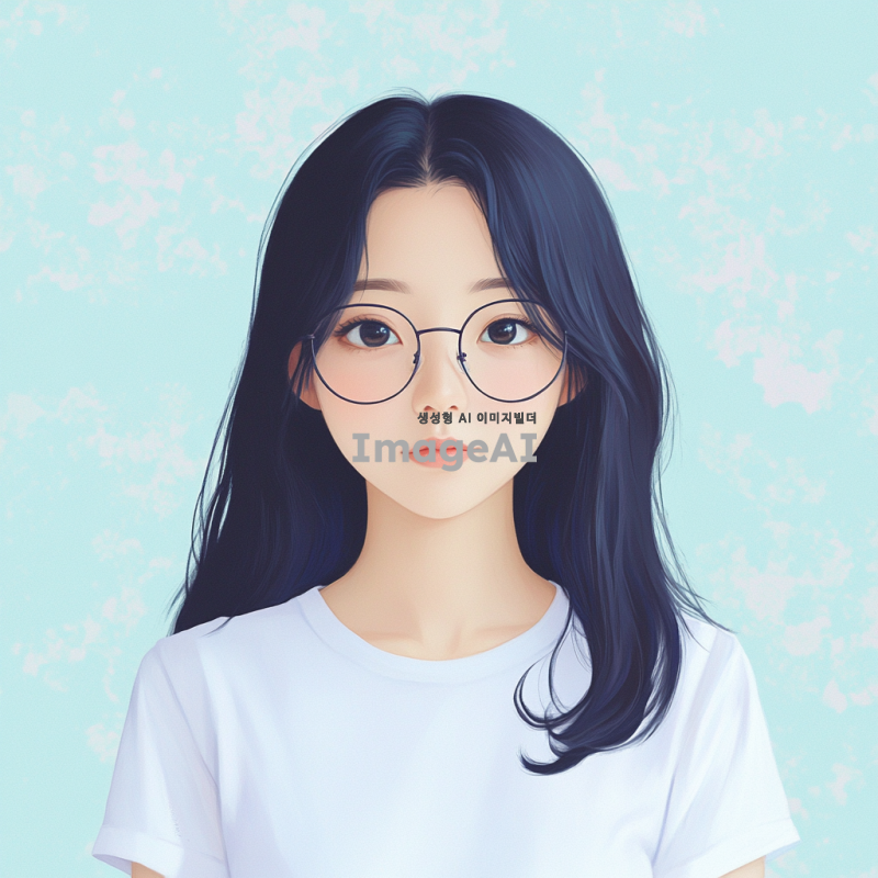 앞머리가 없는 검은머리를 가진 안경을 쓴 20대 한국 여성의 초상화. 그녀는 하얀 반팔을 입고 있으며, 배경은 부드러운 파스텔 톤으로 설정되어 있다. 그녀의 표정은 지적이고 자신감 넘치는 모습으로, 눈빛은 따뜻하고 친근한 느낌을 준다.