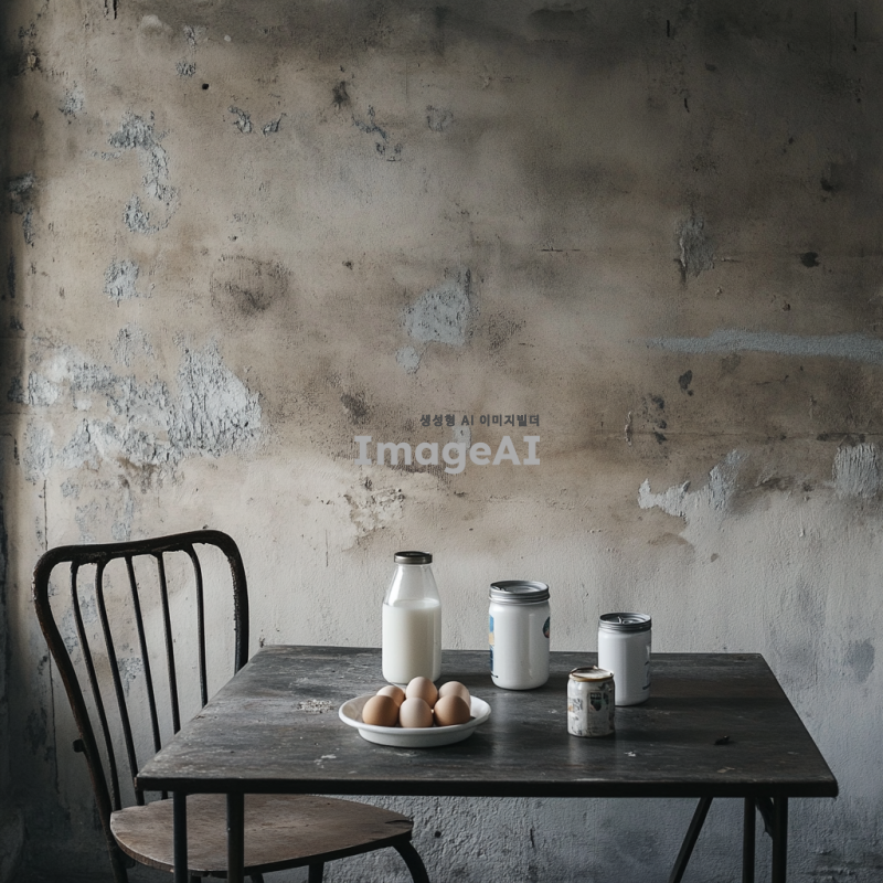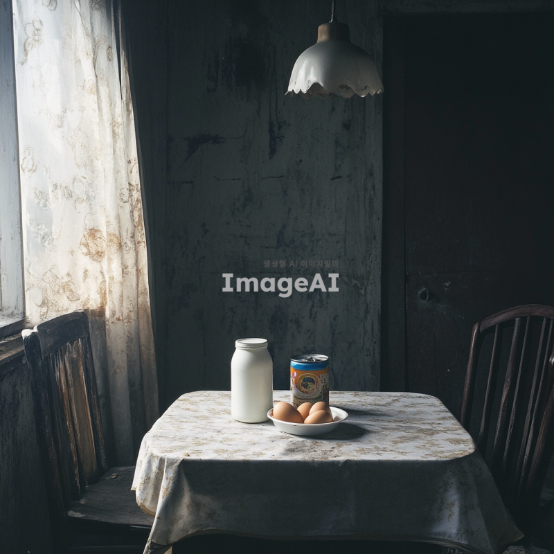 암울한 배경, 통조림과 구운계란 2개와 우유뿐인 조촐한 아침상