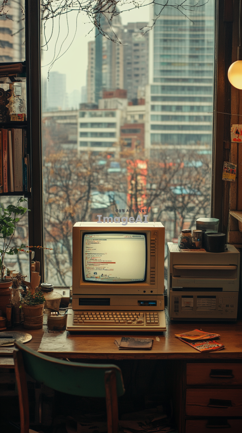 한국의 오래된 컴퓨터 방, 복고풍 디자인의 컴퓨터가 책상 위에 놓여 있고, 주변에는 오래된 책과 빈티지 소품들이 어우러져 있는 모습. 컴퓨터 화면에는 90년대 스타일의 그래픽 인터페이스가 표시되어 있으며, 창문 밖으로는 흐릿한 도시 풍경이 보이는 분위기. 따뜻한 조명 아래에서 아날로그 감성이 느껴지는 공간.