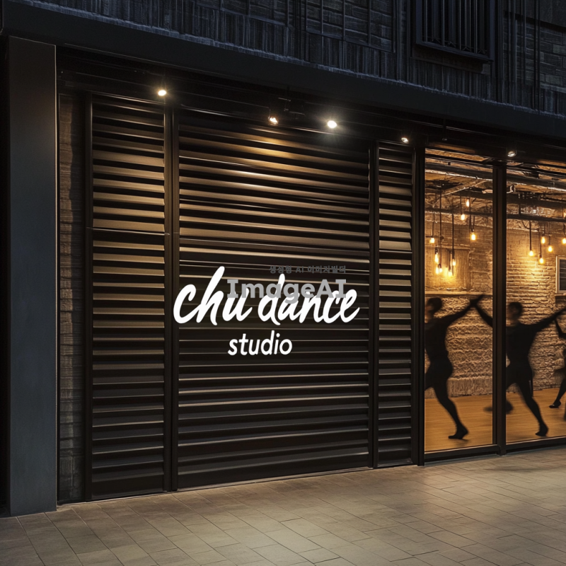 검은색 철문에 하얀색 글씨로 "chu dance studio"라고 새겨진 디자인의 시그니처 셔터를 배경으로 한 이미지. 댄스 학원 옆 벽에 설치된 모습을 보여주며, 댄스 동작을 하는 한국인 댄서들이 주변에서 연습하고 있는 장면. 현대적이고 세련된 분위기를 강조하며, 댄스의 역동성을 표현하는 요소를 포함. 밝은 조명 아래에서 셔터와 댄서들이 조화를 이루는 모습.