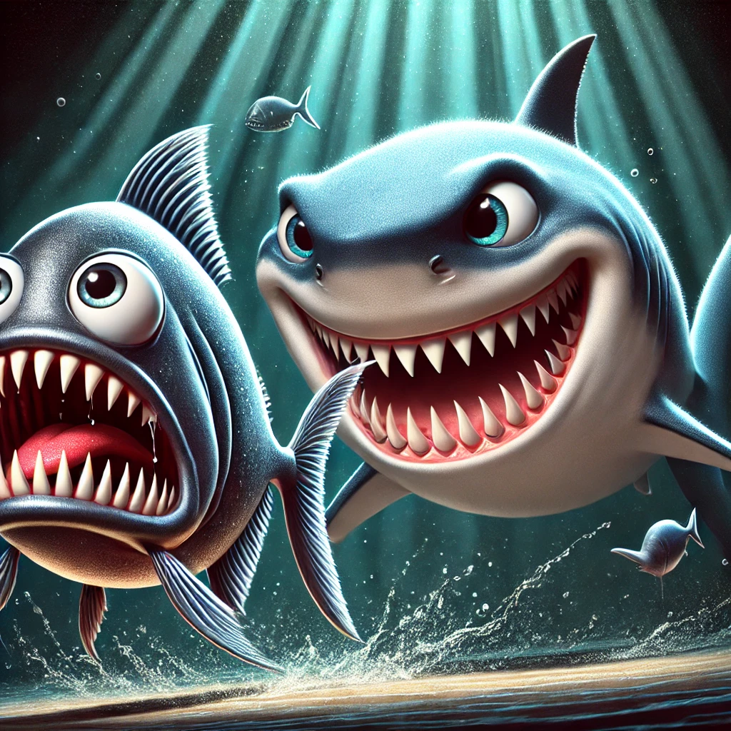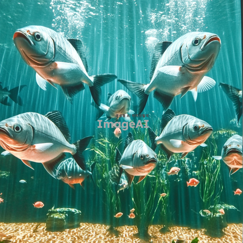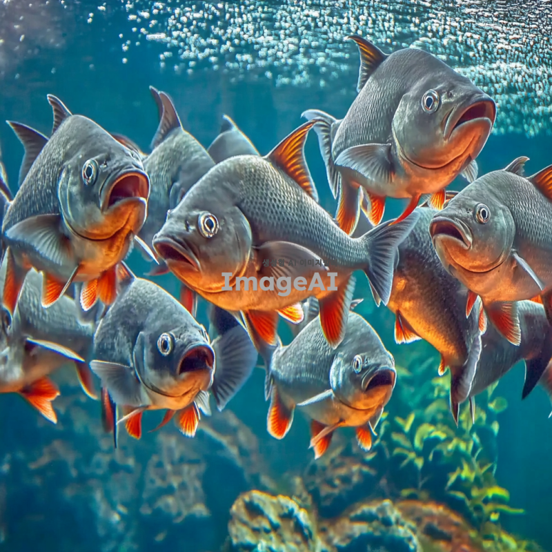 한국의 수족관에서 수영하는 피라냐, 투명한 물속에서 다양한 색상의 피라냐들이 무리 지어 헤엄치는 모습, 주변에는 수초와 바위가 있어 자연스러운 환경을 연출, 물빛은 맑고 햇빛이 비치는 장면, 생동감 있는 해양 생물의 모습.