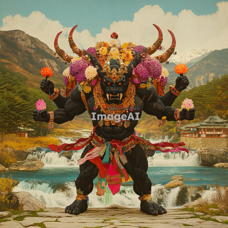 한국의 전통 탈을 기반으로 한 성경의 일곱 머리와 열 뿔을 가진 짐승을 묘사한 이미지. 짐승의 머리는 각각 독특한 디자인과 색상으로 표현되며, 열 뿔은 화려하게 장식되어 있다. 배경은 전통 한국의 풍경으로, 고즈넉한 산과 흐르는 강이 어우러져 있다. 탈의 세부 사항은 정교하고 화려하며, 한국의 전통 문양이 포함되어 있다. 전체적인 분위기는 신비롭고 경외감을 주는 느낌이다.
