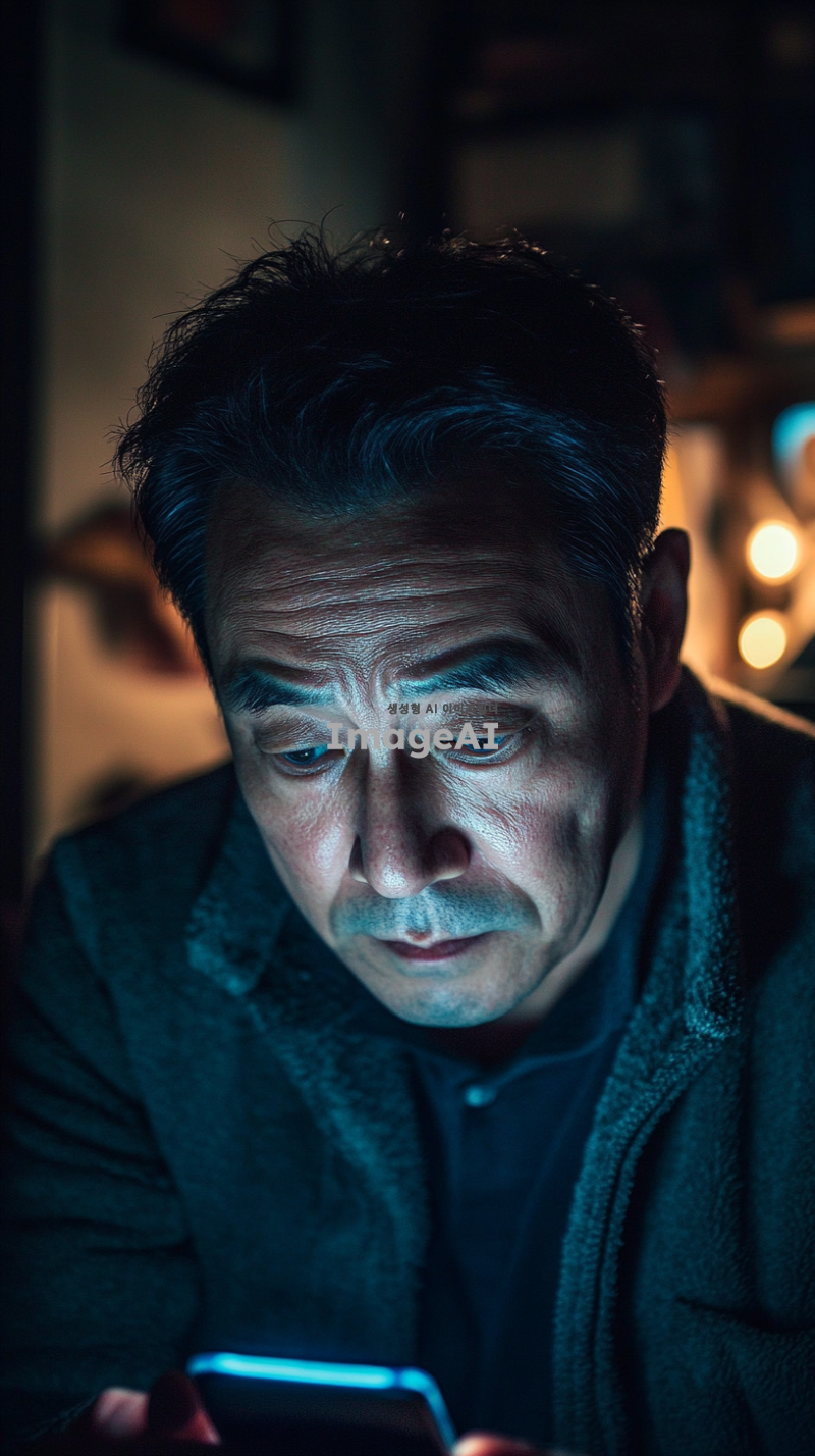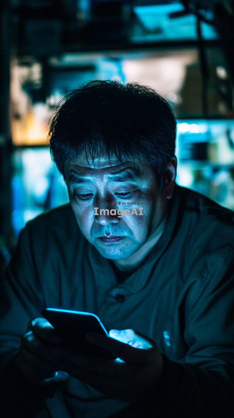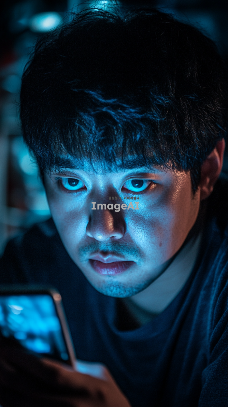 스마트폰 화면을 바라보며 무기력한 표정을 짓고 있는 한국인 남성의 모습. 어두운 방 안에서 희미한 스마트폰 불빛이 얼굴을 비추고 있으며, 그의 눈은 피곤하고 무기력해 보인다. 주변은 정돈되지 않은 모습으로, 불안한 감정을 전달하는 요소들이 배경에 배치되어 있다.