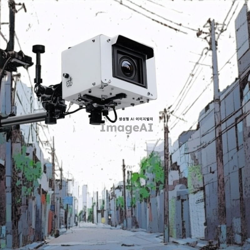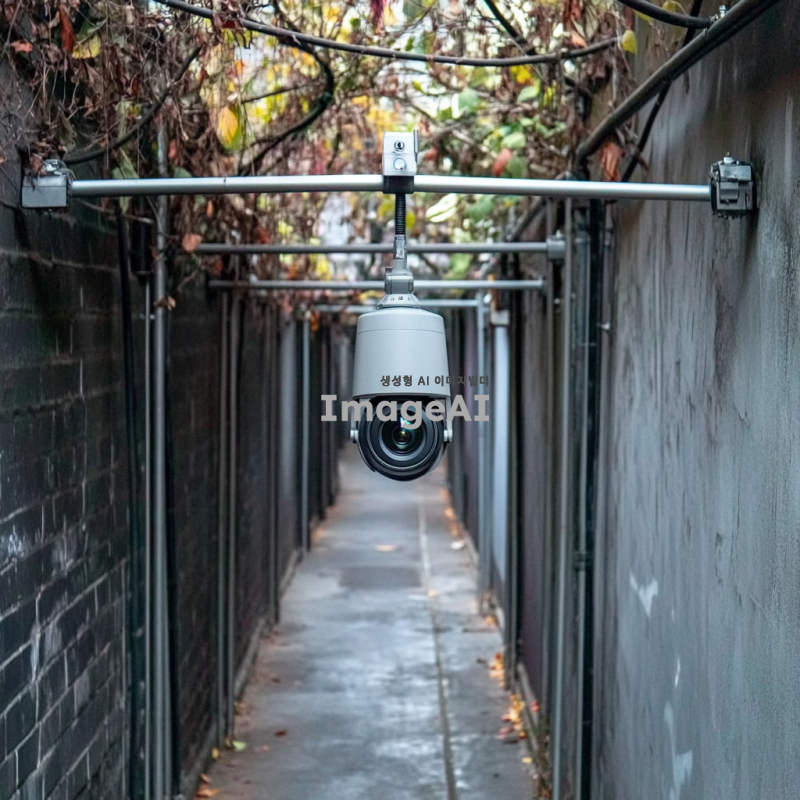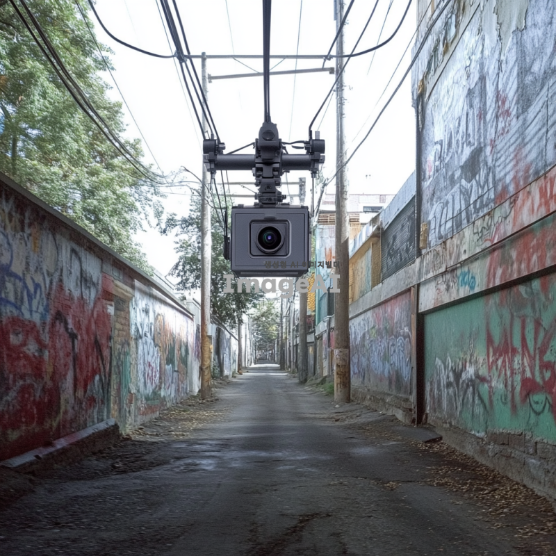 전봇대 사이에 설치된 레일에 매달려 움직이는 카메라의 모습, 카메라는 현대적인 디자인으로, 주변 풍경은어두운 골목길을 표현하고, 전봇대는 튼튼하고 깔끔하게 정렬되어 3~4개 정도 있으며, 4갈래로 되어있는 골목에 카메라가 레일을 따라 부드럽게 이동하고 있는 모습, 전체적으로 기술과 배경이 조화를 이루는 느낌.