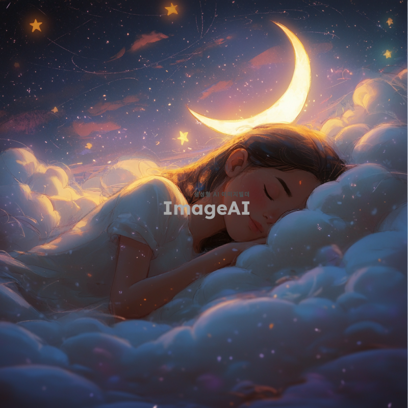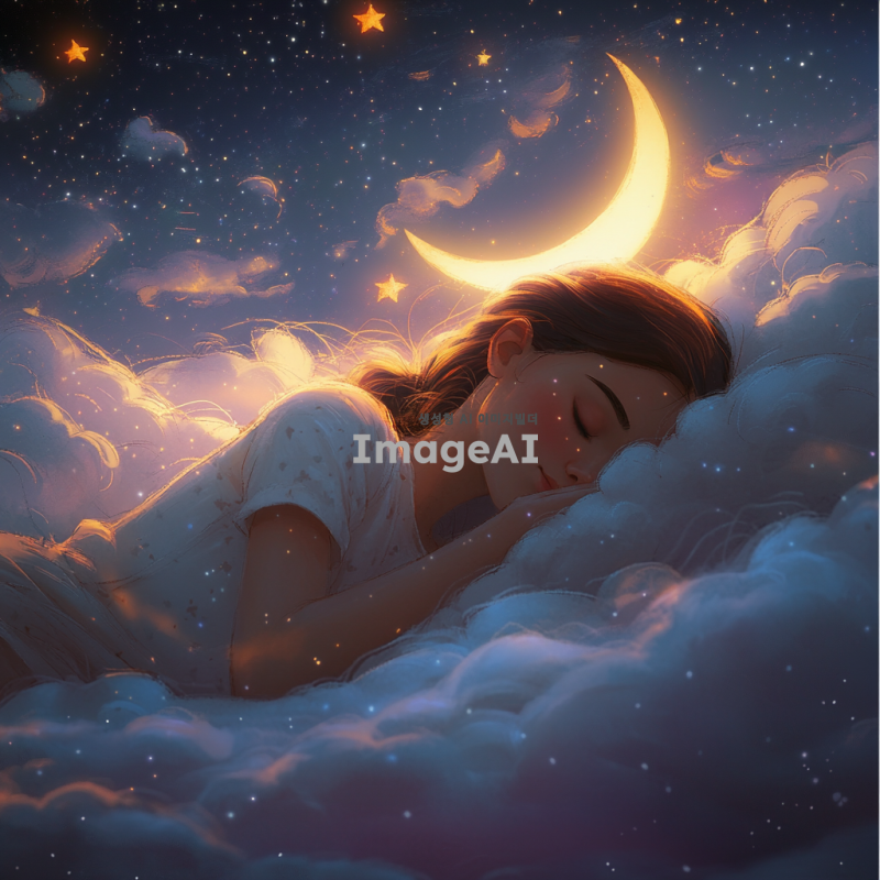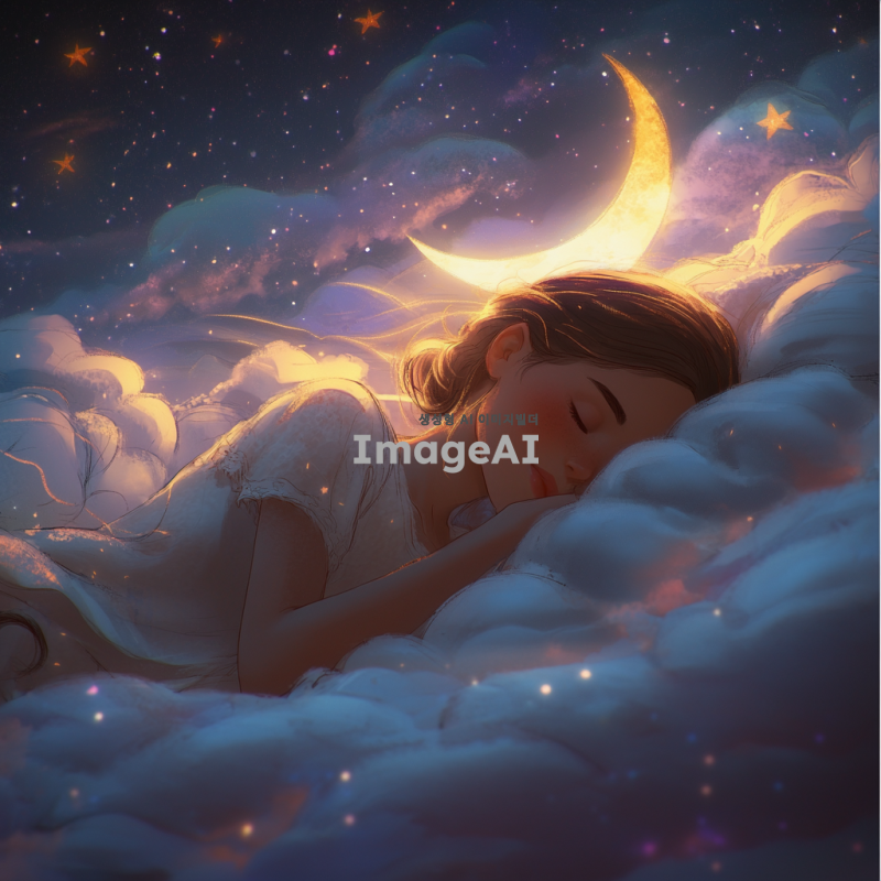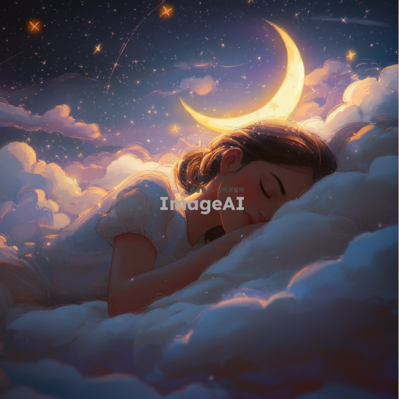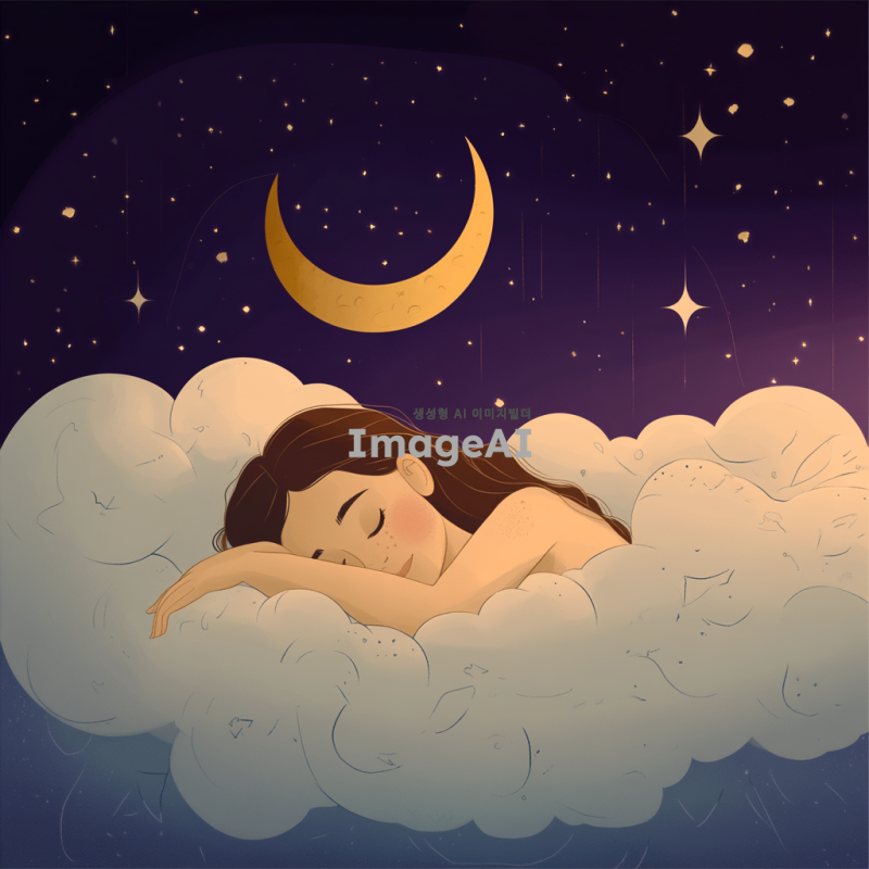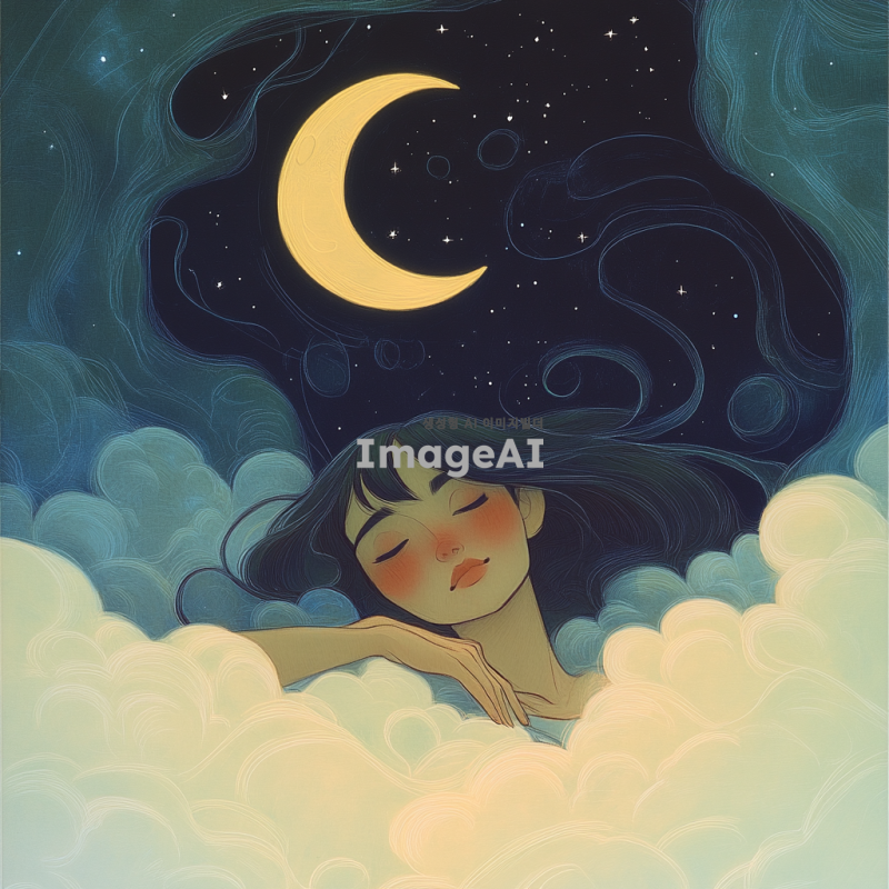 밤하늘에 별들이 반짝이고 초승달이 떠있다. 그 앞에 구름 이불을 덮고 편안한 표정으로 잠든 여성의 모습. 여성의 크기는 전체 이미지의 1/3 정도로 설정하며, 애니메이션 느낌으로 그려준다.