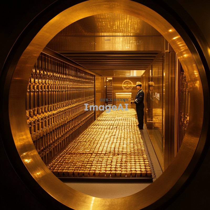 금으로 가득 찬 은행 금고 내부, 반짝이는 금괴들이 정렬되어 있고, 고급스러운 인테리어의 은행 환경, 따뜻한 조명이 비추는 모습, 한국인 경비원이 금고를 지키고 있는 장면, 세련된 느낌의 디자인, 고급스러운 분위기