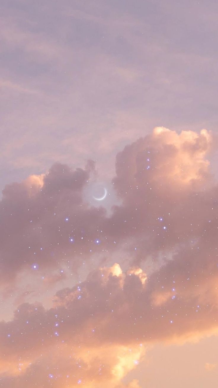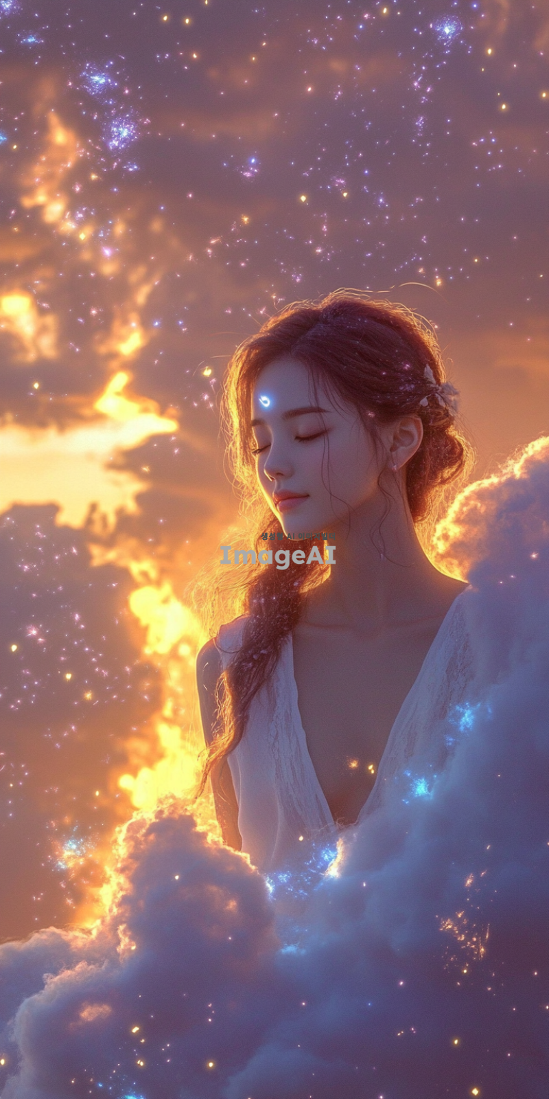 구름에 기대어 잠든 여성, 흰원피스를 입고, 구름을 안고 잠듬, 미소를 지으며 편안히 잠든 모습, 노란색과 보라색 그라데이션 하늘배경, 밝은 파스텔톤, 따뜻하고 편안한 분위기, 영화 마리이야기 애니매이션 스타일의 그림체, 여성이 1/3 크기