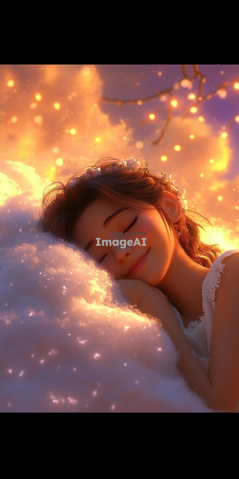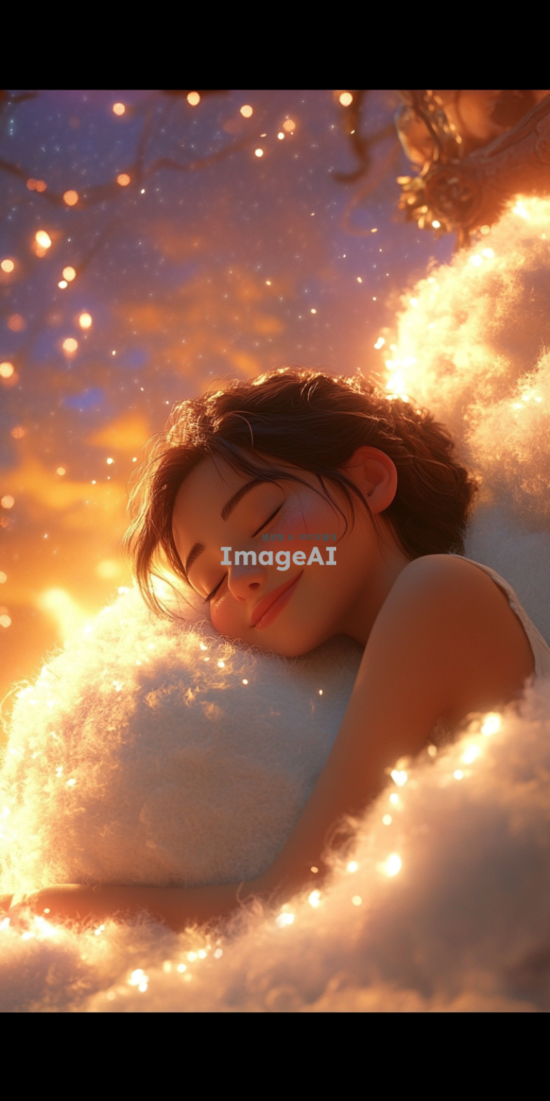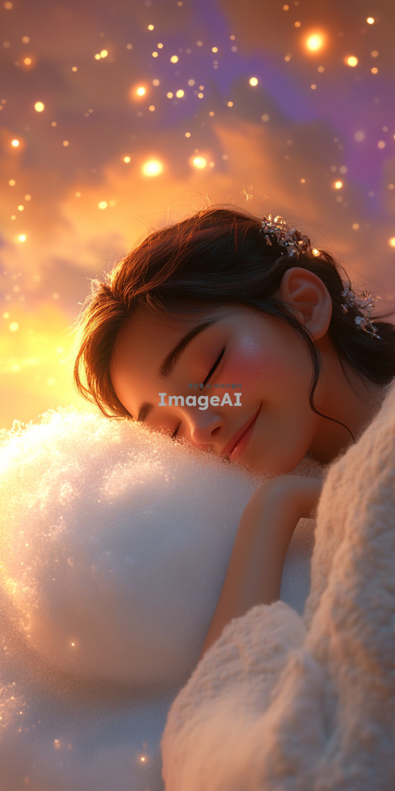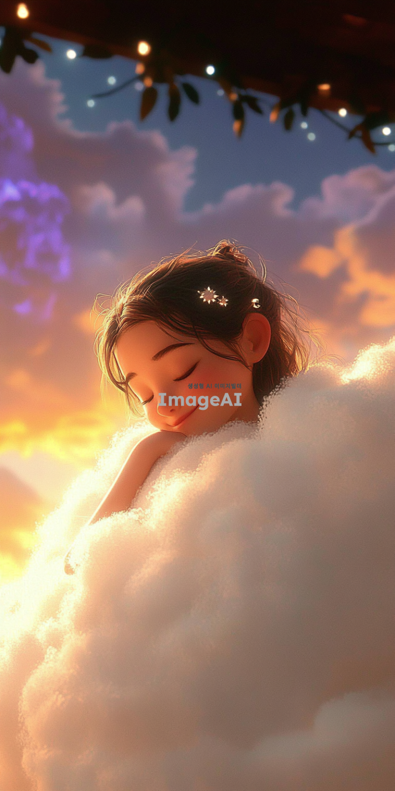 구름에 기대어 잠든 한국인 여성, 흰 원피스를 입고 있으며, 구름을 안고 편안하게 잠들고 있는 모습. 미소를 지으며 아늑한 분위기를 자아내고, 배경은 노란색과 보라색의 그라데이션 하늘. 전체적으로 밝은 파스텔톤으로 따뜻하고 편안한 느낌을 주며, 영화 '마리 이야기' 애니메이션 스타일의 그림체로 표현. 여성이 전체 이미지의 1/3 크기로 배치.