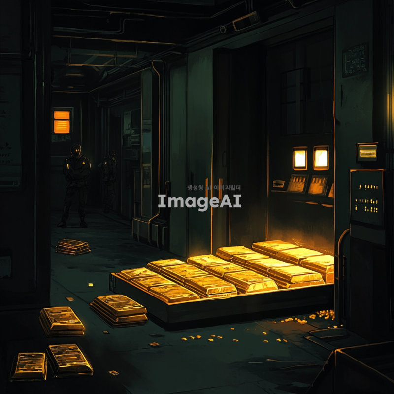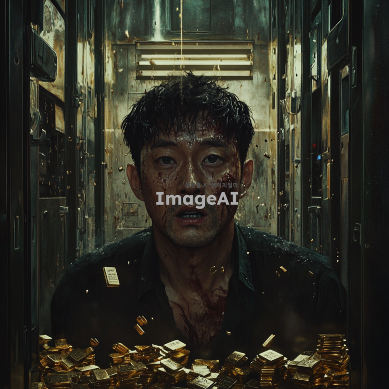 어두운 은행 금고 안, 금괴가 흩어져 있는 장면, 금괴의 반짝임이 어둠 속에서 빛나고, 긴장감 넘치는 분위기, 은행의 안전장치가 파손된 모습, 주위에 흩어진 금괴와 함께 긴장한 한국인 경비원의 표정, 사건의 긴박함을 느낄 수 있는 디테일한 배경.