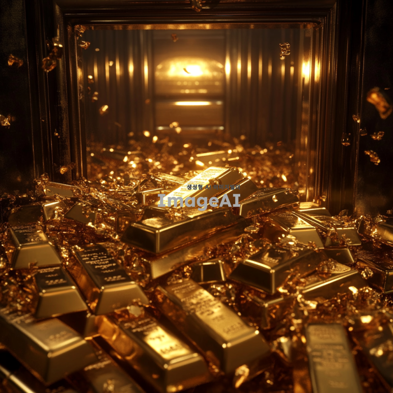 은행의 금고에서 도난당한 금괴가 흩어진 모습. 어두운 금고 안에서 금괴가 반짝이며, 주변에는 혼란스러운 분위기가 감돌고 있다. 금괴 위에는 세밀한 질감과 반사광이 잘 드러나고, 금고의 금속 문은 열려 있으며, 배경에는 어두운 그림자와 함께 은행의 고급스러운 인테리어가 보인다. 긴장감 넘치는 상황을 강조하기 위해, 주변에 흩어진 서류와 경고등이 깜빡이는 모습도 포함.