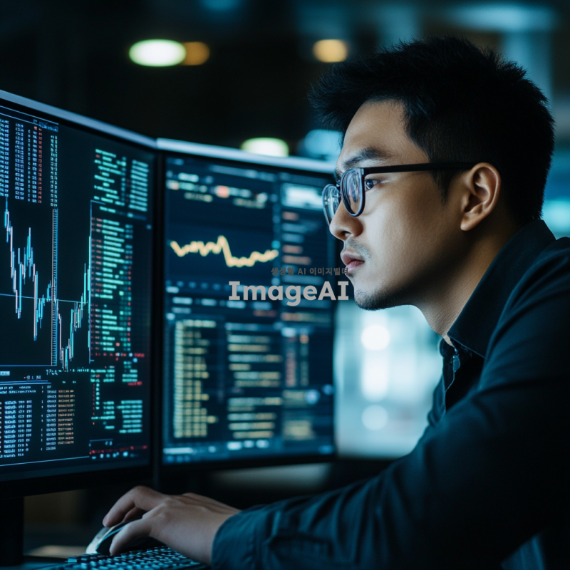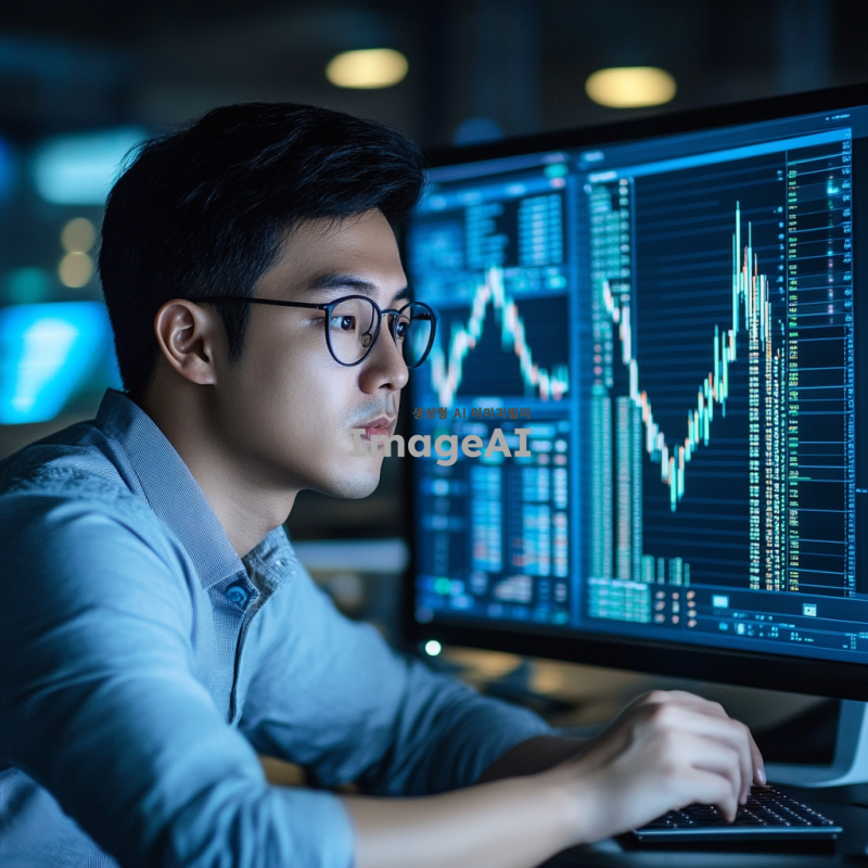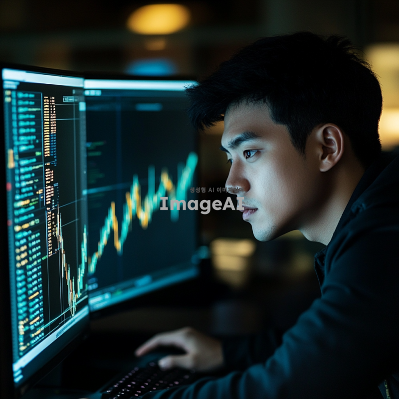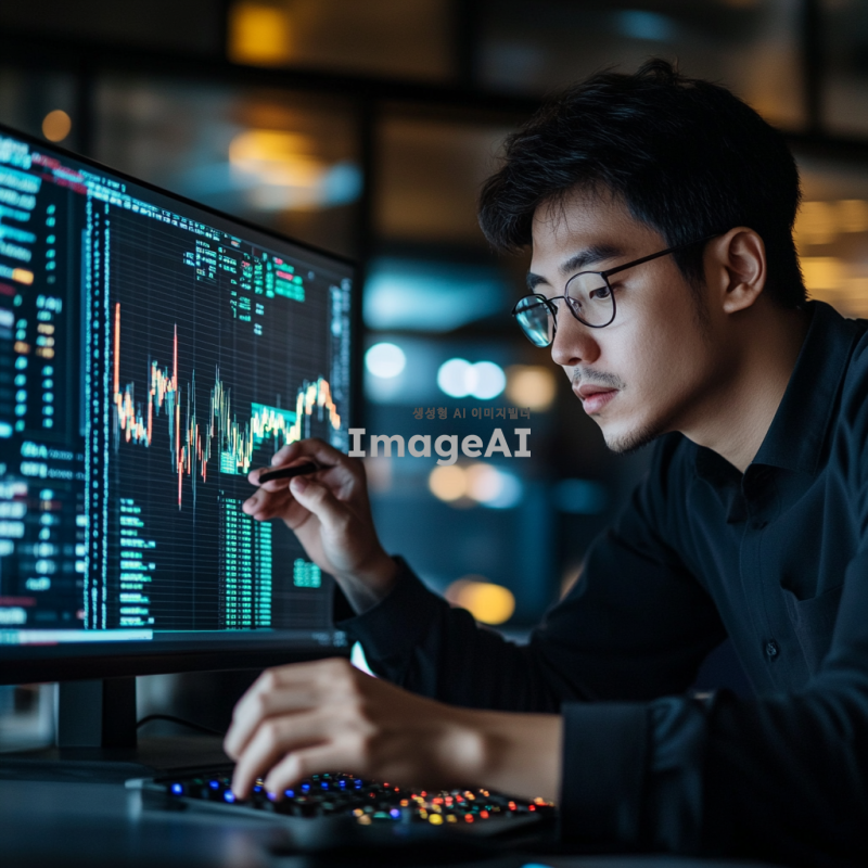 가상 화폐의 세계를 탐험하는 한국인 남성, 컴퓨터 앞에서 암호화폐 차트를 분석하며 집중하는 모습, 현대적인 사무실 배경, 디지털 통화의 그래픽이 화면에 보이는 장면, 미래 지향적인 분위기, 차가운 색조의 조명, 기술적인 느낌 강조.
