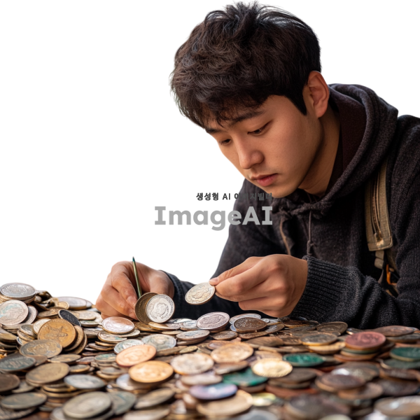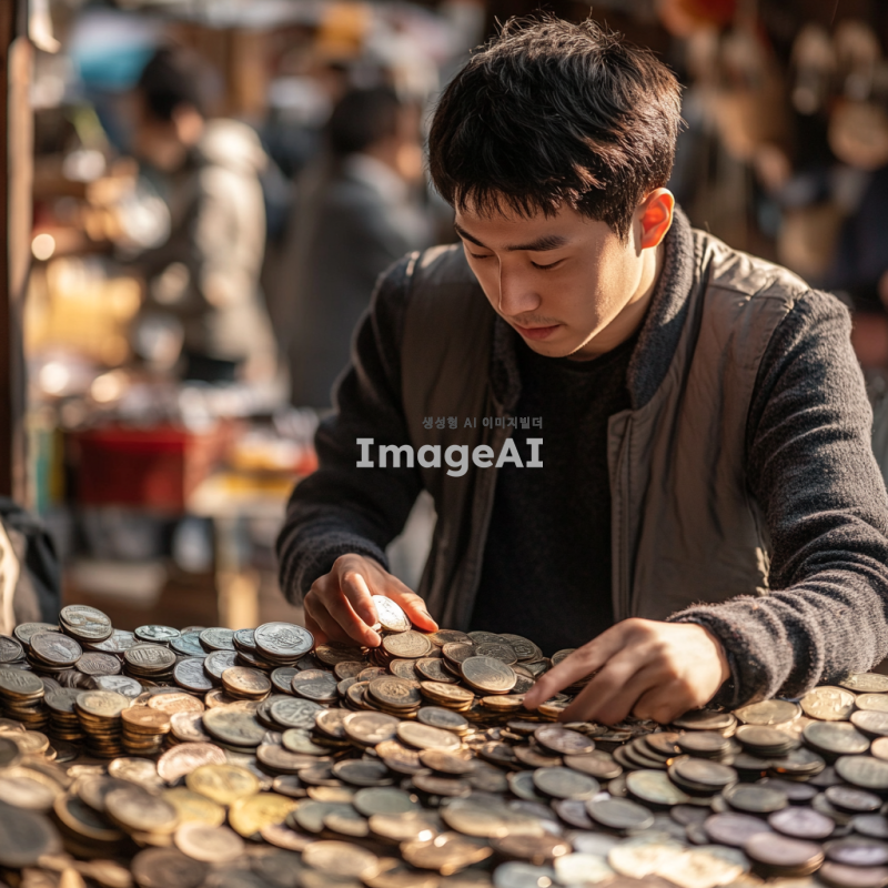 한국의 전통 시장에서 여러 종류의 코인을 정리하고 있는 젊은 남성의 모습. 그는 코인들을 손에 들고 집중해서 살펴보고 있으며, 주변에는 다양한 동전과 지폐가 흩어져 있다. 배경에는 전통적인 한국의 상점과 사람들의 모습이 보인다. 자연광이 들어와 따뜻한 분위기를 자아내고 있다.