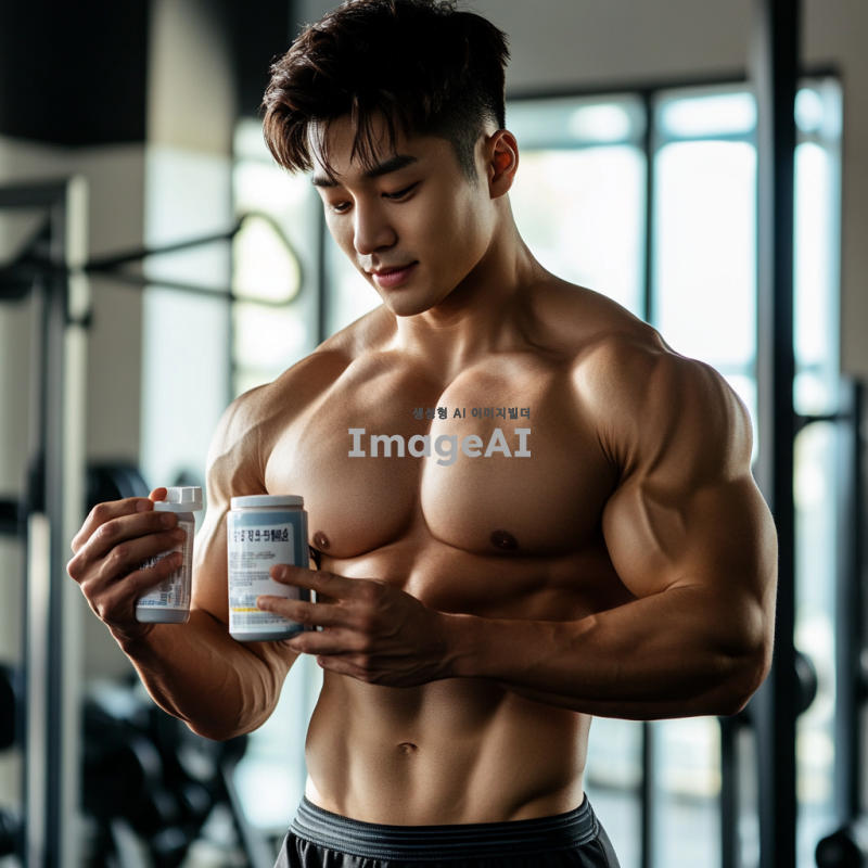 한국인 남성이 헬스장에서 크레아틴을 섭취하며 운동하는 모습, 근육이 발달한 체격, 운동복을 입고 있는 모습, 배경에는 다양한 운동 기구와 함께 활기찬 분위기, 자연광이 들어오는 창문이 있는 실내 환경, 집중한 표정으로 크레아틴을 섭취하는 장면.