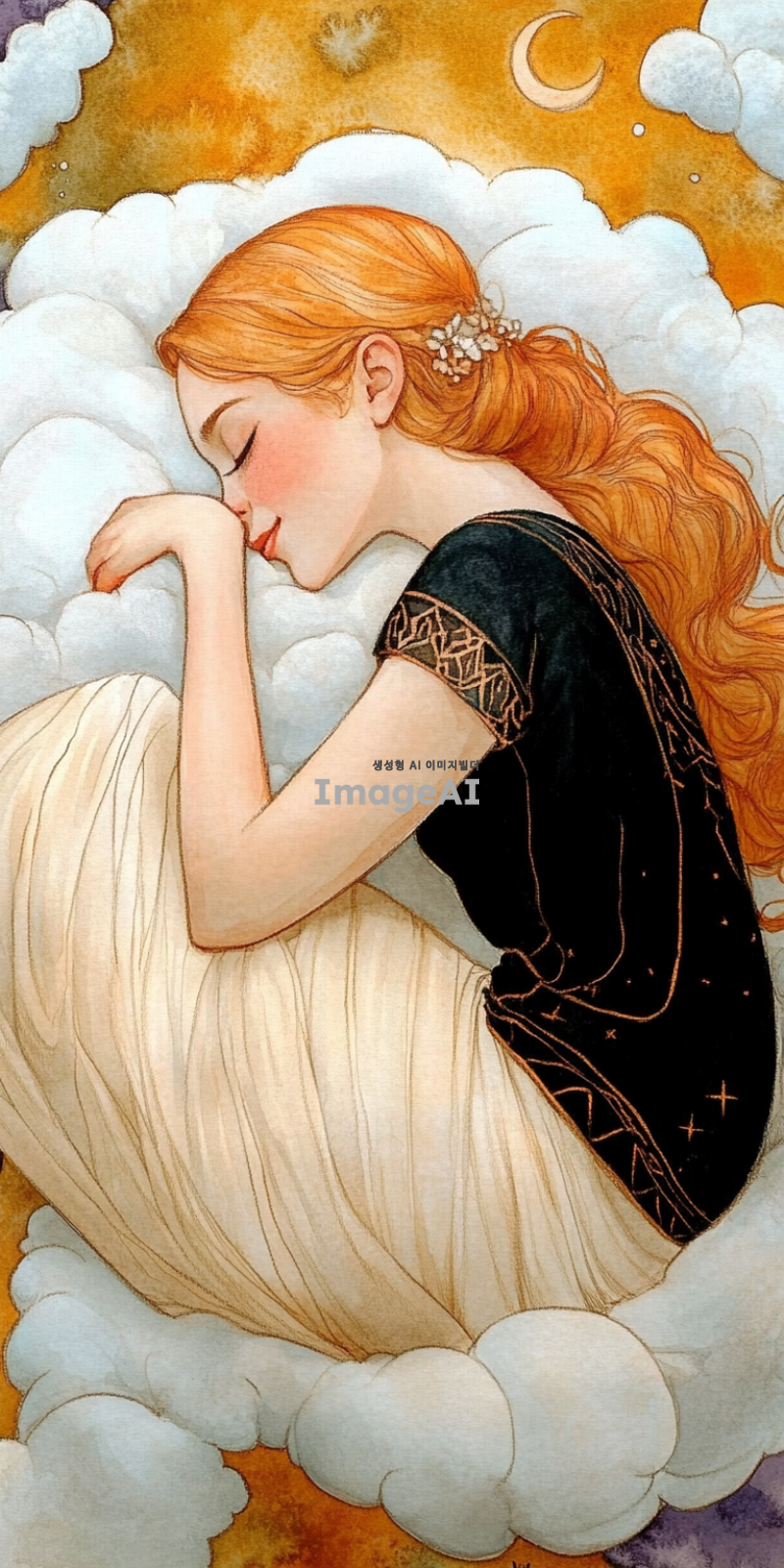 구름위에서 잠든 여자아이, 수채화 동화같은 그림체, 노랑과 보라색이 썩인 파스텔톤의 배경, 여성의 크기가 1/3, 행복한 미소를 머금은 여성의 얼굴, 일러스트, 구름에 둘러싸인 여성