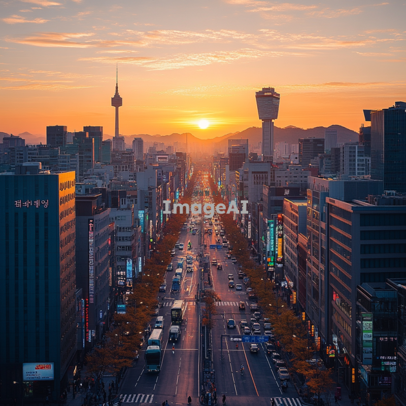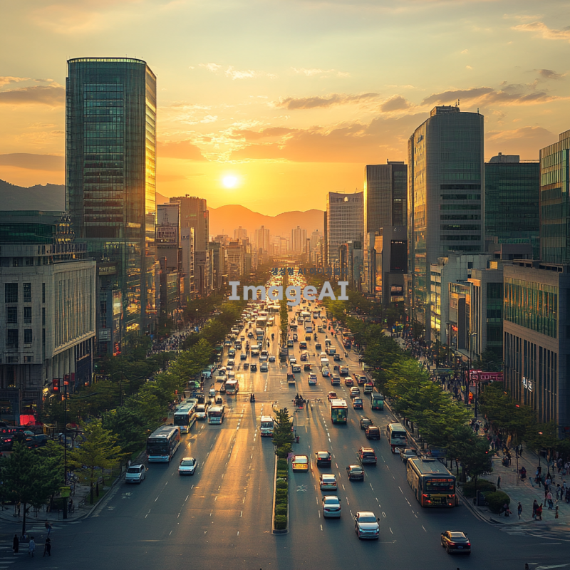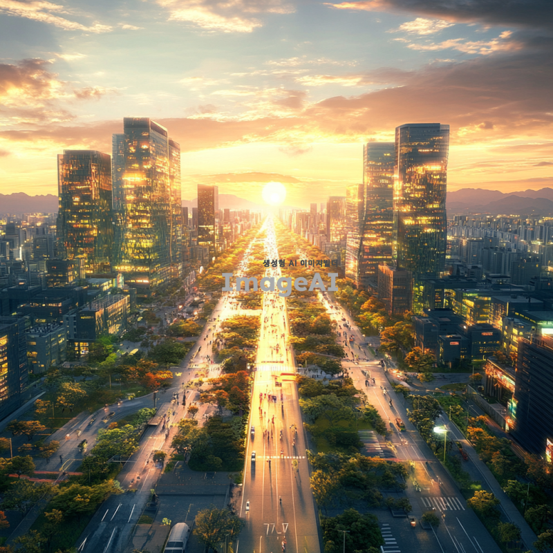 혁명적인 변화와 재탄생을 상징하는 한국의 도시 풍경, 현대적 건축물과 자연이 조화를 이루는 모습, 활기찬 사람들로 가득 찬 거리, 다양한 문화와 전통이 어우러진 장면, 희망과 에너지가 넘치는 분위기, 밝고 생동감 있는 색감, 미래 지향적인 느낌의 일출 배경.