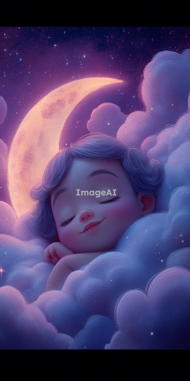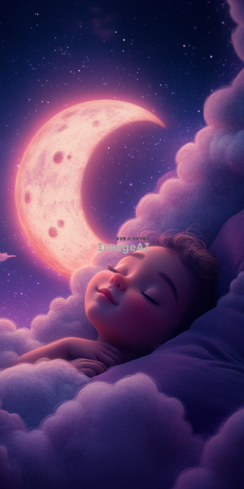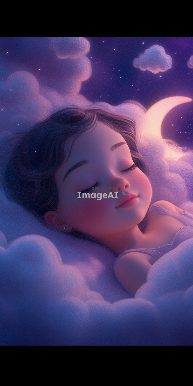 달이 자고 있고, 아기 소녀가 눈을 감고 침대에서 자고 있으며, 구름으로 둘러싸여 있다. 보라색-분홍색 그라디언트 하늘의 배경은 부드러운 빛이 비추어져 있어 평온함과 따뜻함이 가득한 분위기를 만들어낸다. 이 장면은 고화질 이미지를 제공하며, 손으로 그린 애니메이션 스타일을 통해 섬세한 질감을 보여준다. 픽사의 애니메이션 장편 영화 스타일로, 이 클로즈업은 얼굴 표정과 질감, 그리고 밤하늘의 풍경을 세밀하게 포착한다.