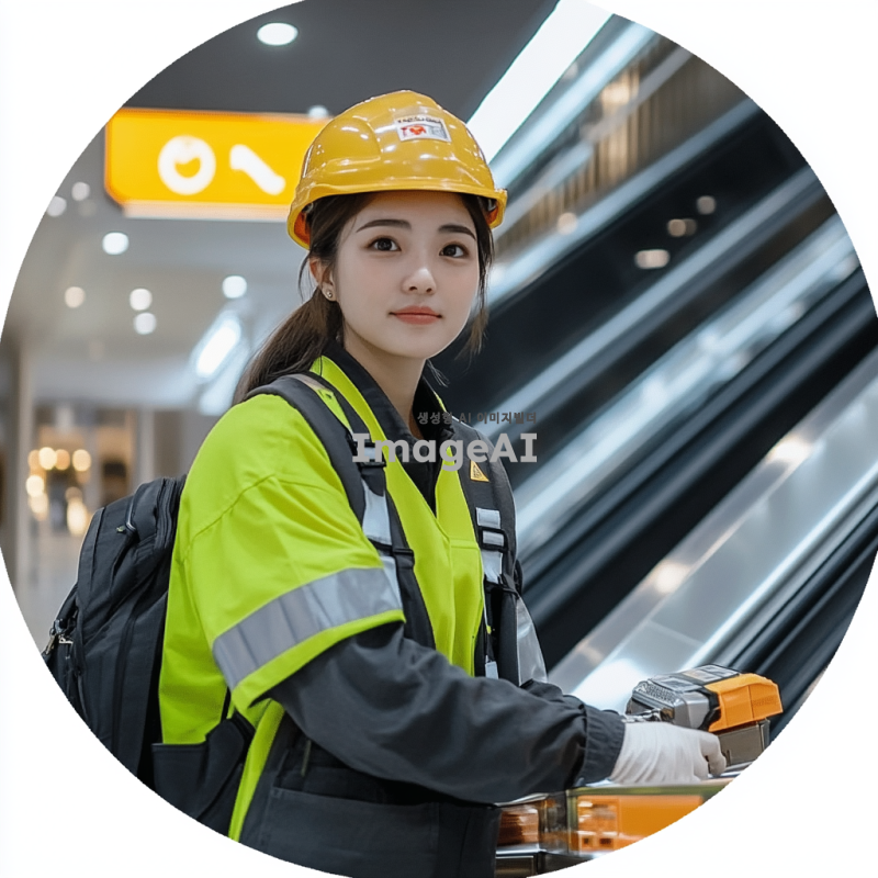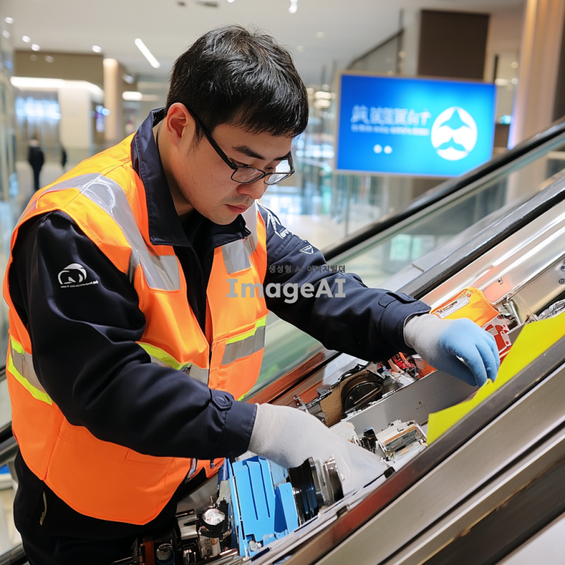 승강기안전공단의 직원들이 에스컬레이터 법정 검사를 진행하고 있는 장면. 직원들은 안전복을 착용하고 있으며, 에스컬레이터의 다양한 부품을 점검하고 있다. 주변에는 검사 장비와 도구들이 정리되어 있고, 에스컬레이터는 현대적이고 깨끗한 디자인이다. 검사 중인 직원의 표정은 진지하고 집중하고 있으며, 배경에는 승강기안전공단의 로고가 보인다.