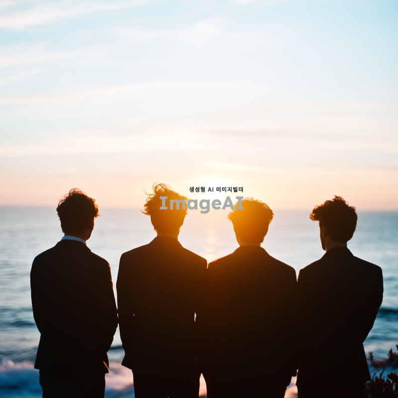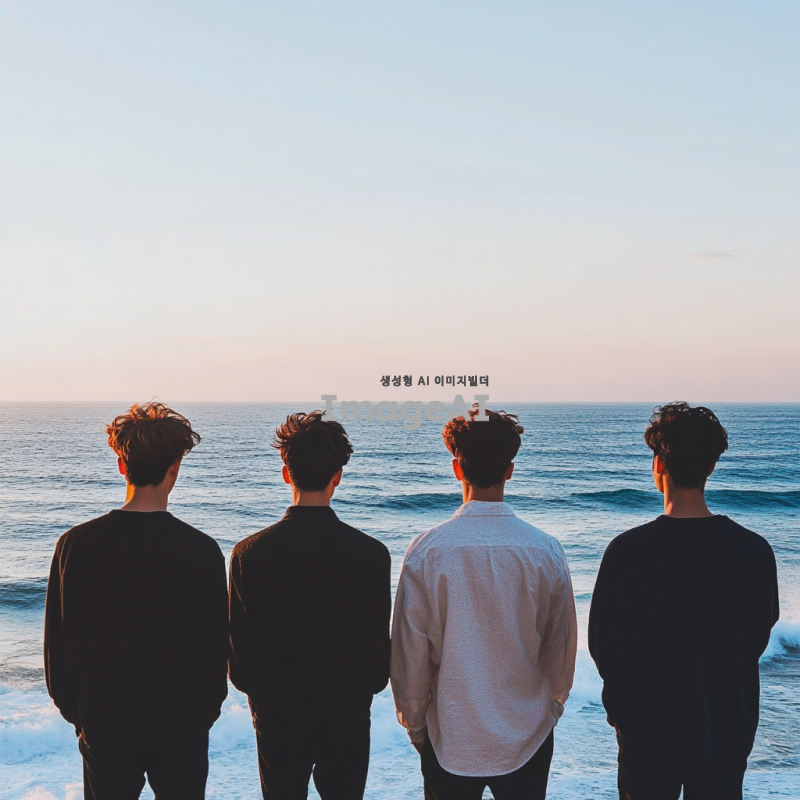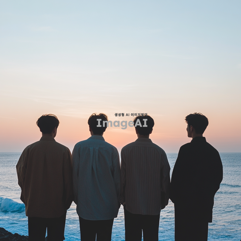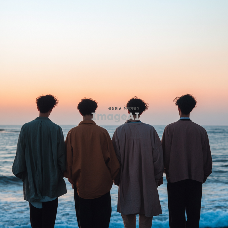 푸른 바다를 배경으로 서 있는 네 명의 남자, 각각 다른 스타일의 옷을 입고 있으며, 뒷모습으로 바다를 바라보고 있는 모습. 해가 지고 있는 시간대에 따뜻한 빛이 남자들의 실루엣을 감싸고 있고, 바다의 파도가 잔잔하게 밀려오는 장면. 남자들의 머리 스타일은 다양하며, 자연스러운 분위기를 강조.