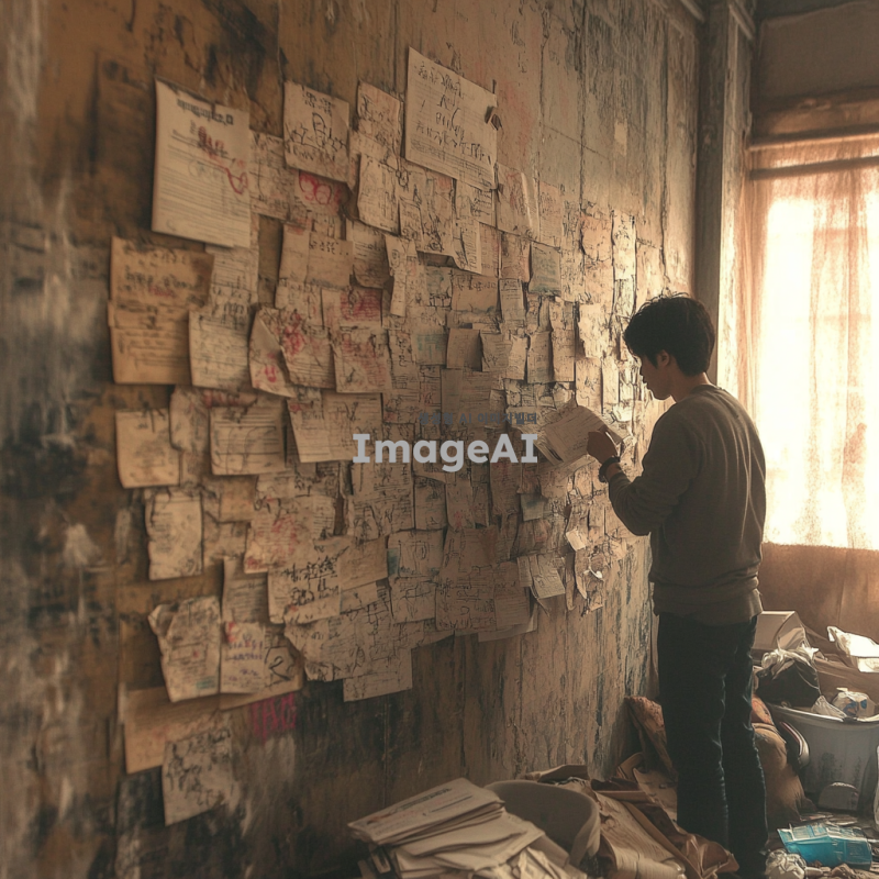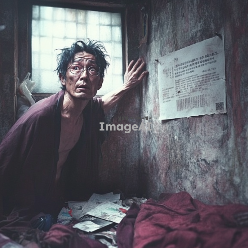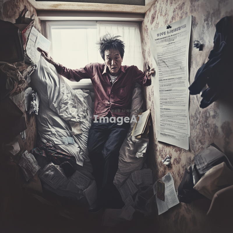 아파트 내부, 압류 통지서가 붙어 있는 벽, 긴장한 표정의 한국인 남성이 서 있는 모습, 주변에는 정리되지 않은 짐과 서류들이 흩어져 있는 장면, 어두운 조명과 우울한 분위기, 현실적인 디테일 강조.