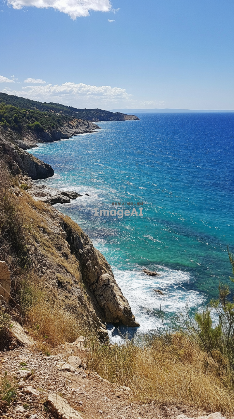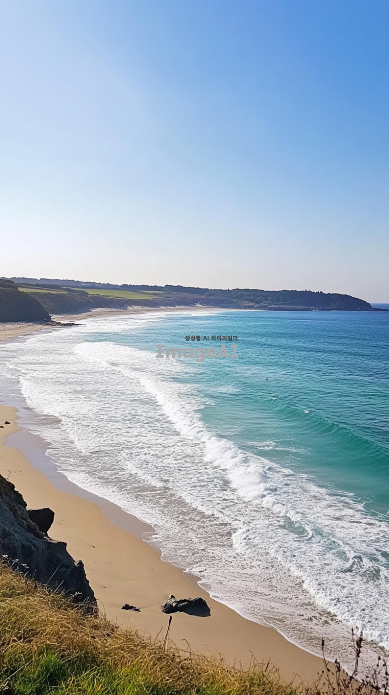 푸른 바다와 부드러운 파도가 있는 풍경, 햇살이 비치는 따뜻한 날씨, 잔잔한 파도가 해변에 부딪히는 모습, 바다의 깊은 색감과 하늘의 맑은 푸른색이 어우러진 자연적인 장면, 여성스러운 느낌을 주는 부드러운 색조와 조화로운 구성이 돋보이는 이미지.