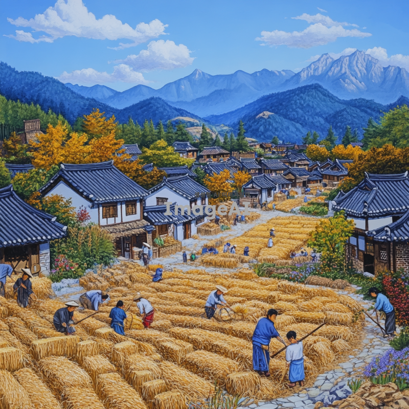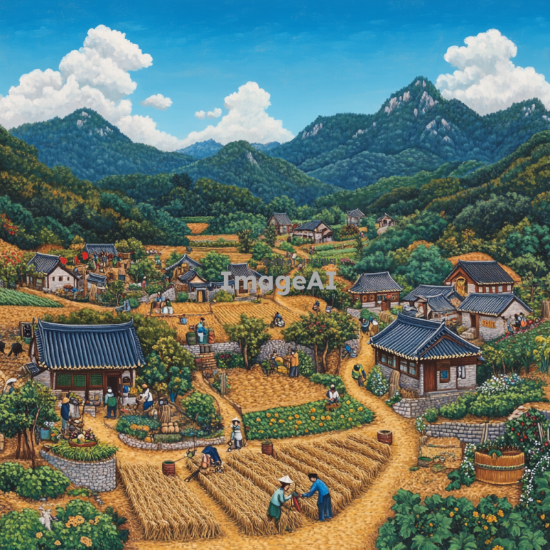 한국의 전통적인 마을 풍경, 다양한 사람들이 함께 협력하여 농작물을 수확하는 모습, 서로 돕고 소통하는 따뜻한 분위기, 배경에는 푸른 산과 맑은 하늘, 전통 가옥과 현대적인 건물이 조화롭게 어우러진 장면, 상생과 협력의 메시지를 담은 이미지.