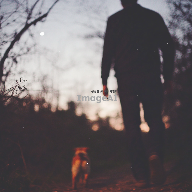 어두운 밤, 별빛이 반짝이는 하늘 아래, 한국인 남성이 귀여운 강아지와 함께 산책하는 모습. 남성은 편안한 옷을 입고, 강아지는 리드줄에 매여 있으며, 주변에는 나무와 풀들이 어우러져 있는 자연 풍경. 강아지는 활기차고 호기심 가득한 표정으로 주변을 탐색하고 있다. 달빛이 부드럽게 비추는 가운데, 두 사람의 행복한 순간을 포착한 장면.