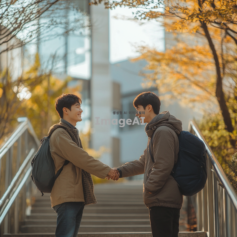 계단 제일 위에 서 있는 한국 남성이 아래에 있는 남성을 손을 잡고 도와주는 모습, 두 사람의 표정은 따뜻하고 서로를 신뢰하는 느낌, 주변은 자연광이 비추는 밝은 분위기, 배경은 현대적인 건물과 나무가 어우러진 풍경, 두 사람의 의상은 캐주얼하고 편안한 스타일, 서로의 눈을 바라보며 미소 짓고 있는 장면.